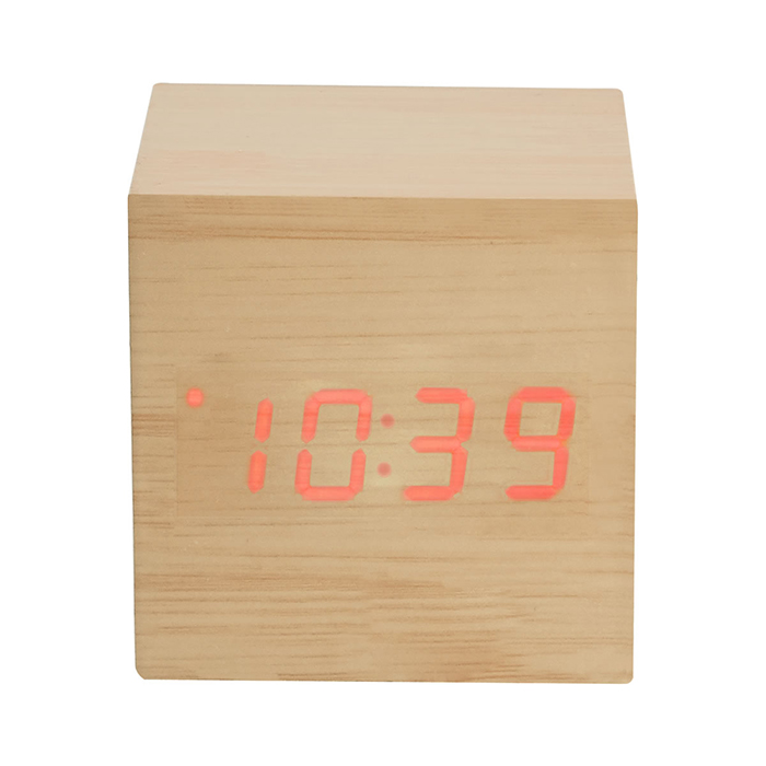 RELOJ TIME CUBE(Reloj de madera con LED. Funciones: hora, alarma (se pueden programar 3 alarmas), calendario y temperatura. Baterías (3 pilas AAA) no incluidas. Incluye caja individual.)