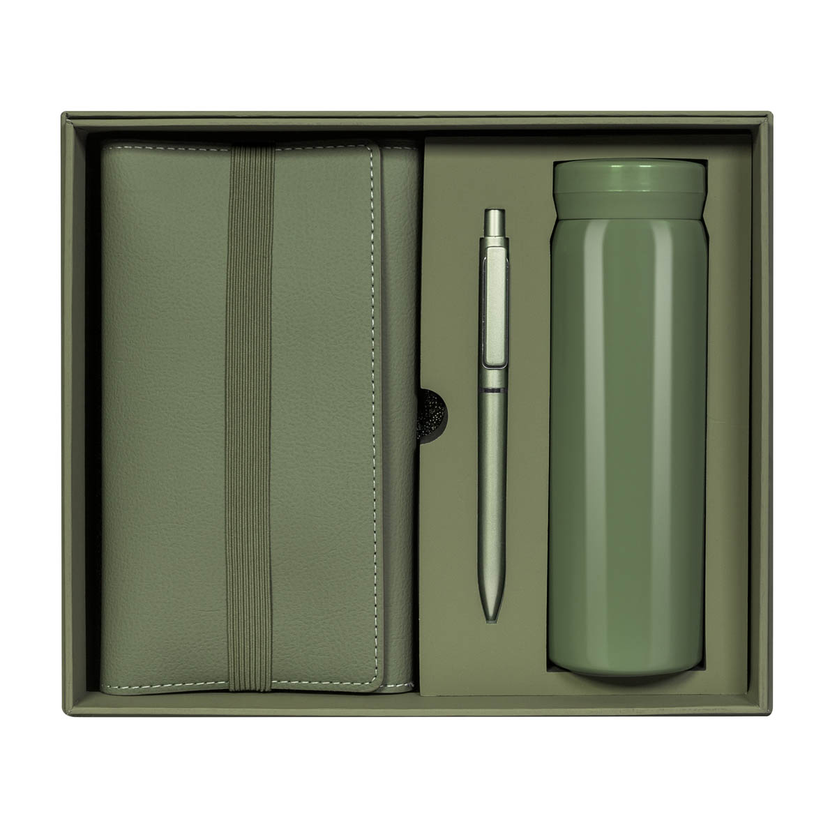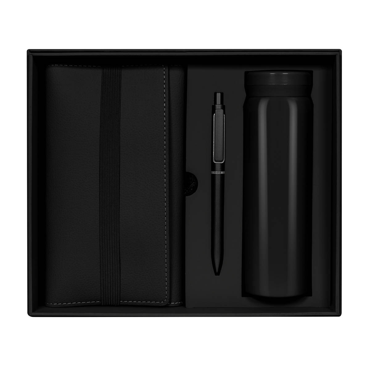Set de regalo. Incluye: termo de doble pared metalica con tapa de plastico con sistema de rosca, boligrafo de plastico con sistema push, libreta con pasta de curpiel suave con cierre de elastico y 70 hojas a rayas, al interior de la libreta incluye dos bloques de notas adhesivas y 5 banderines, ademas de agregar compartimentos para tarjetas o pequeños documentos. Presentado con atencion al detalle en un empaque de calidad y mucho color, este set es el regalo perfecto para cualquier ocasion especial.