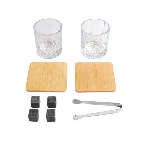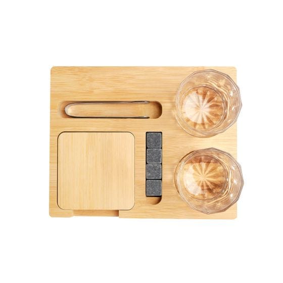 Set de Bar. Incluye 2 vasos de cristal para whisky, 4 cubos de piedra enfriadores, 2 portavasos de bambú, pinzas de acero inoxidable y base organizadora de bambú. Incluye caja individual. Regalo ideal para los amantes del whisky, las piedras no diluirán el sabor de tu bebida.