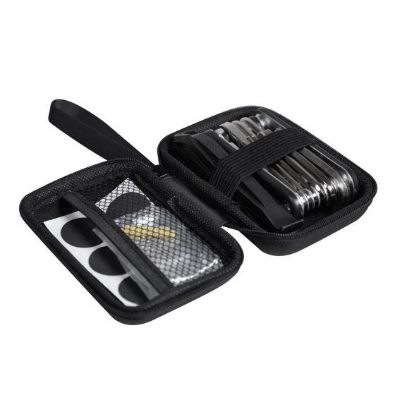Estuche compacto de EVA con elastico que lo hace facil de transportar y se ajusta de manera conveniente a la bicicleta o al equipo de ciclismo. Incluye una variedad de herramientas esenciales, como 6 parches redondos para neumatico, 2 palancas de plastico para neumatico, 2 tubos de goma para fijar valvulas, 1 herramienta de lijado y herramienta multifuncion 16 en 1 con llaves allen y destornilladores.
