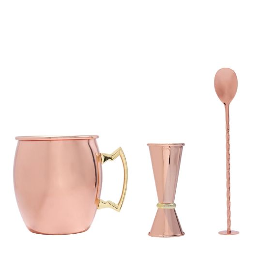 Set de mixología. Ideal para preparar bebidas de coctelería. Incluye 2 tarros metálicos, dosificador con graduación, agitador y caja individual.