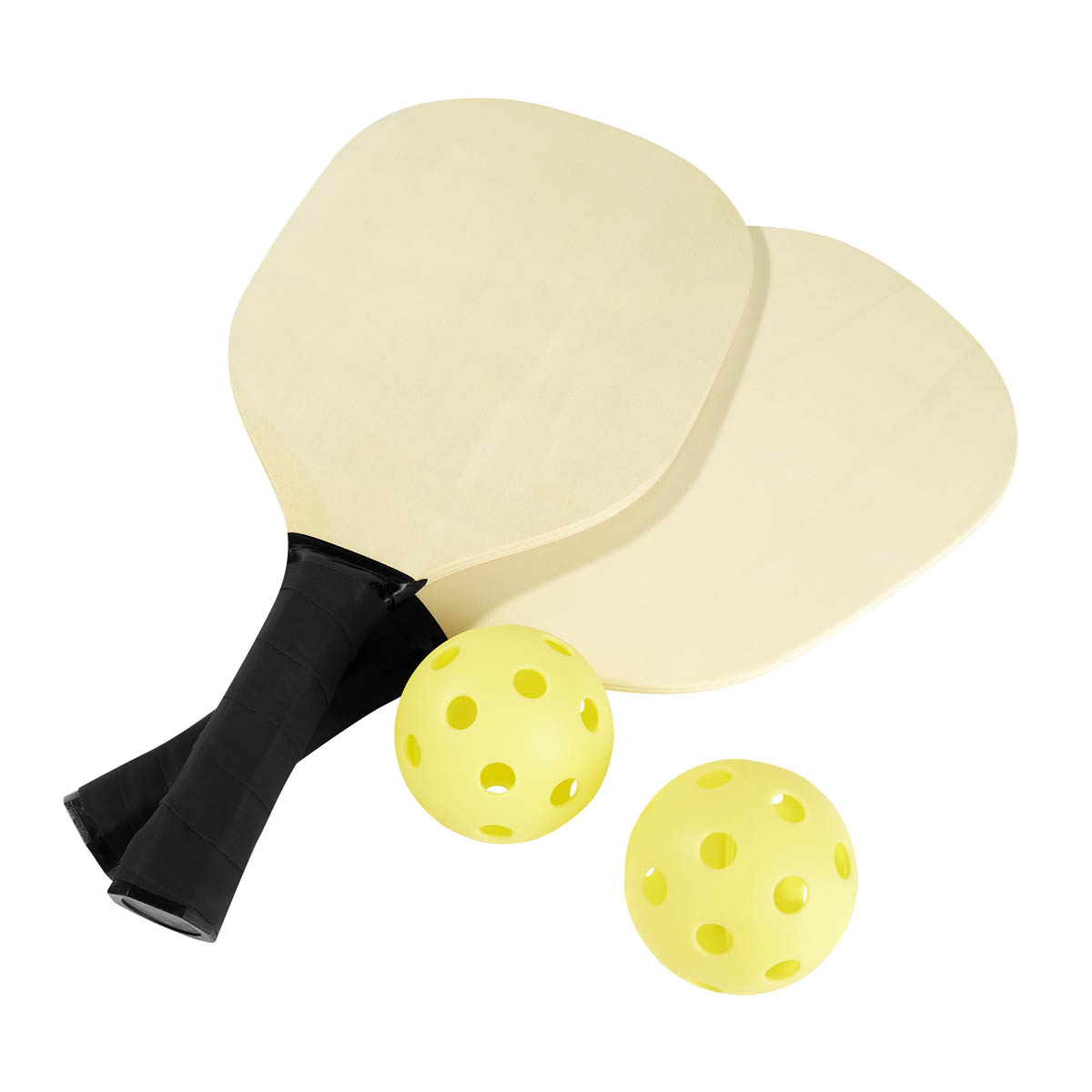 Set de raquetas para pickleball. Incluye dos raquetas de madera con mango ergonomico, dos pelotas de plastico y bolsa con malla para transportar. Este set es ideal tanto para los que buscan disfrutar del deporte en cualquier lugar.