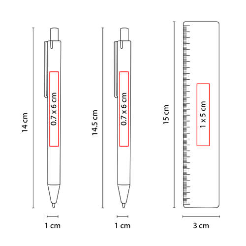 1 x 14 cm bolígrafo / 1 x 14.5 cm lapicera / 3 x 15 cm regla / 3 x 2 cm borrador