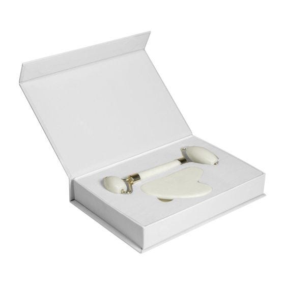 Set masajeador facial de piedra natural. Incluye 1 rodillo para masajear y estimular la piel, ayudando a mejorar la circulacion sanguinea y reducir la hinchazon facial; 1 piedra facial, se utiliza para aplicar presion y realizar movimientos de deslizamiento sobre la piel. Ayuda a aliviar la tension muscular y a mejorar la absorcion de productos para el cuidado de la piel. Caja individual con cierre imantado.
