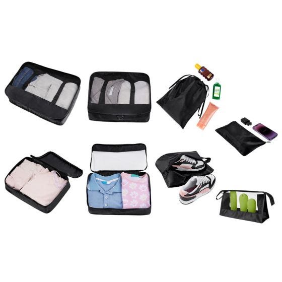 Organizador de maleta 8 en 1. Incluye 3 bolsas para ropa con malla para una mejor ventilación, la bolsa grande y mediana incluyen dos sujetadores interiores con broche de plástico para organizar tus artículos, además de broches de plástico que te permiten unir las diferentes piezas, 1 bolsa con cierre y asa para ropa interior, 1 bolsa con cierre para calzado, 1 bolsa con cierre tipo jareta, 1 bolsa chica con cierre y 1 bolsa cosmetiquera con malla.