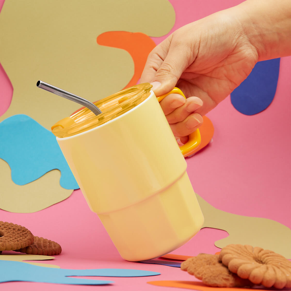 Taza de ceramica. Incluye tapa de plastico con sistema push, sobretapa deslizable y funcion adiconal para popote. Agrega tambien, un popote metalico reutilizable. Disenada con colores vibrantes que alegran cualquier ocasion. Incluye caja individual de color.