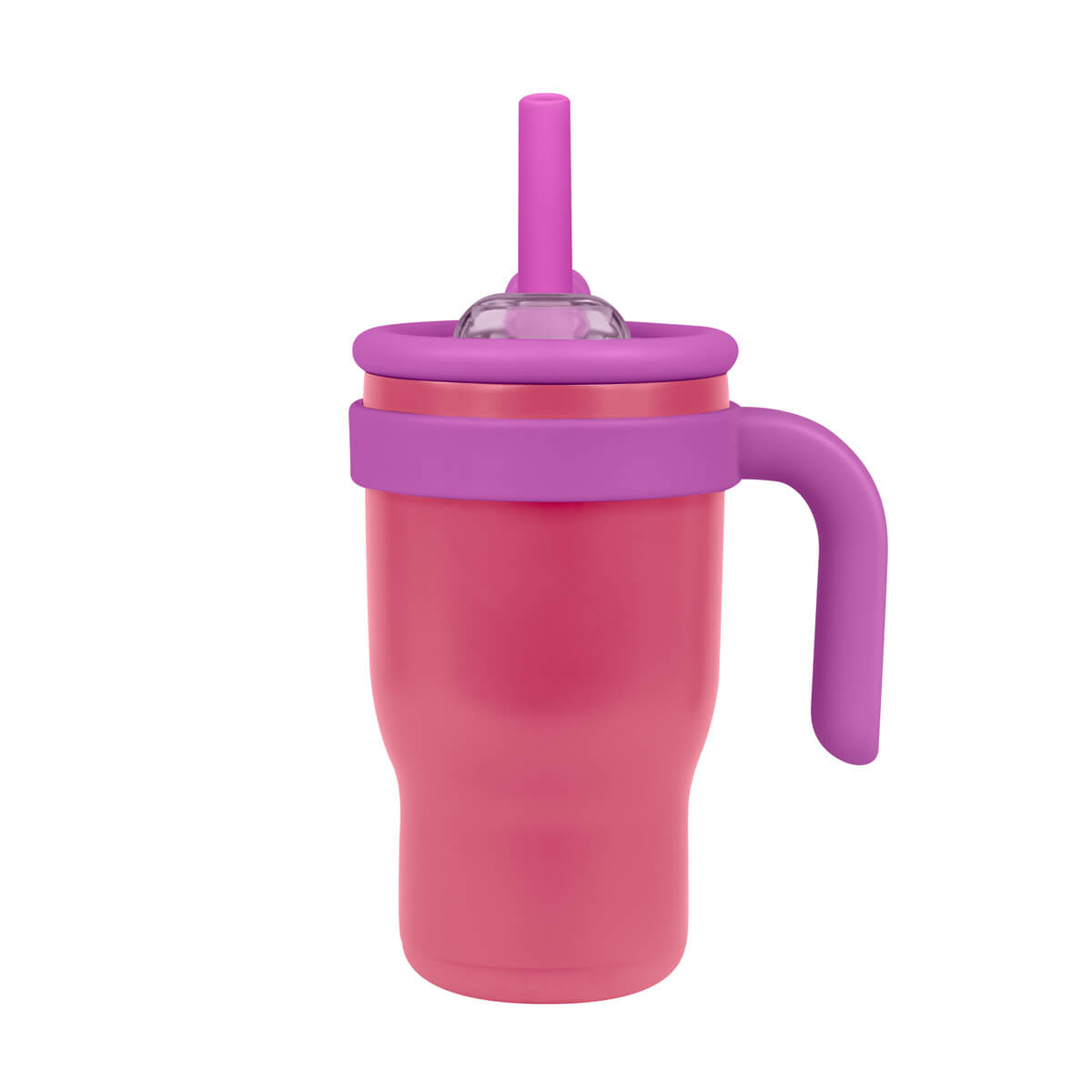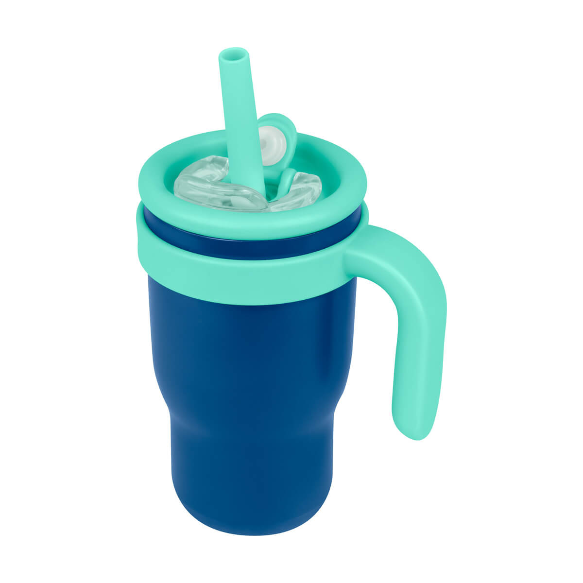 Termo doble pared. Cerrado al vacio. Pared interna y externa de acero inoxidable. Tapa de plastico con cierre de rosca que le aporta mayor seguridad. Cuenta con dos funcionalidades en la tapa, boquilla para beber con sobre tapa push y ranura para popote con sobre tapa adicional. Popote con boquilla de silicon, avanzado sistema de cierre anti derrames y asa de plastico. Su practico tamano, te permitira transportarlo facilmente a cualquier lugar. Ideal para ninos y adultos. Mantiene temperatura caliente 6 hrs y fria 8 hrs. Capacidad de 15 Oz. Base de 6.5 cm de diametro. Incluye cuerpo con terminado rugoso y caja individual.
