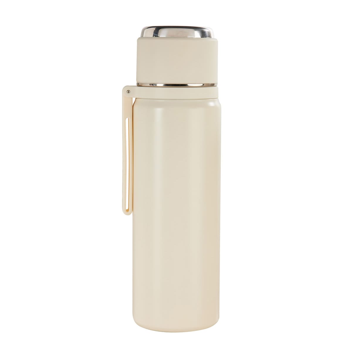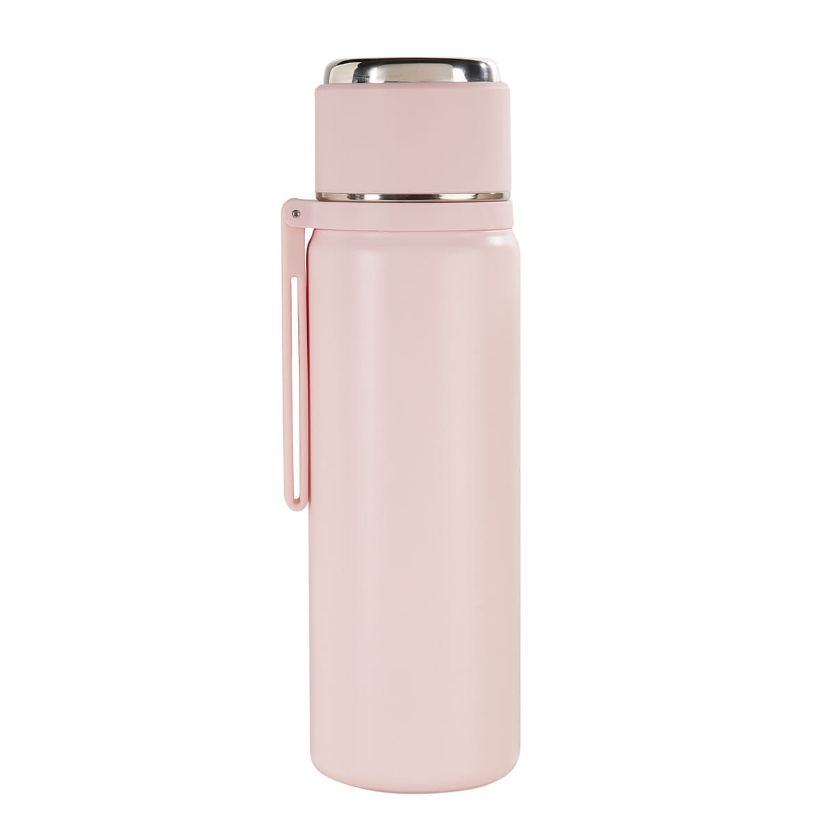 Termo doble pared. Cerrado al vacio. Pared interna y externa acero inoxidable. Tapa de plastico con sistema de rosca, boquilla y boton de seguridad para mantener cerrado y sin derrames, incluye sobretapa metalica de rosca. Cuenta con un asa de silicon para llevarlo facilmente a donde quiera que vayas. Mantiene la temperatura caliente por 12 hrs y la temperatura fria por 24 hrs. Capacidad de 17 Oz. Incluye caja individual.