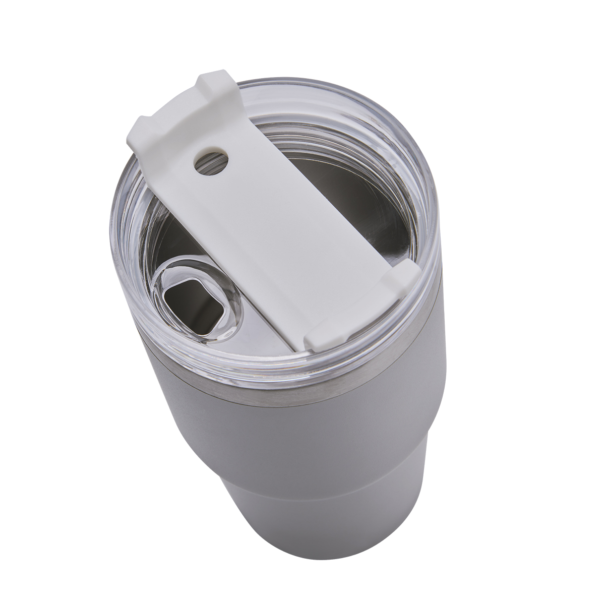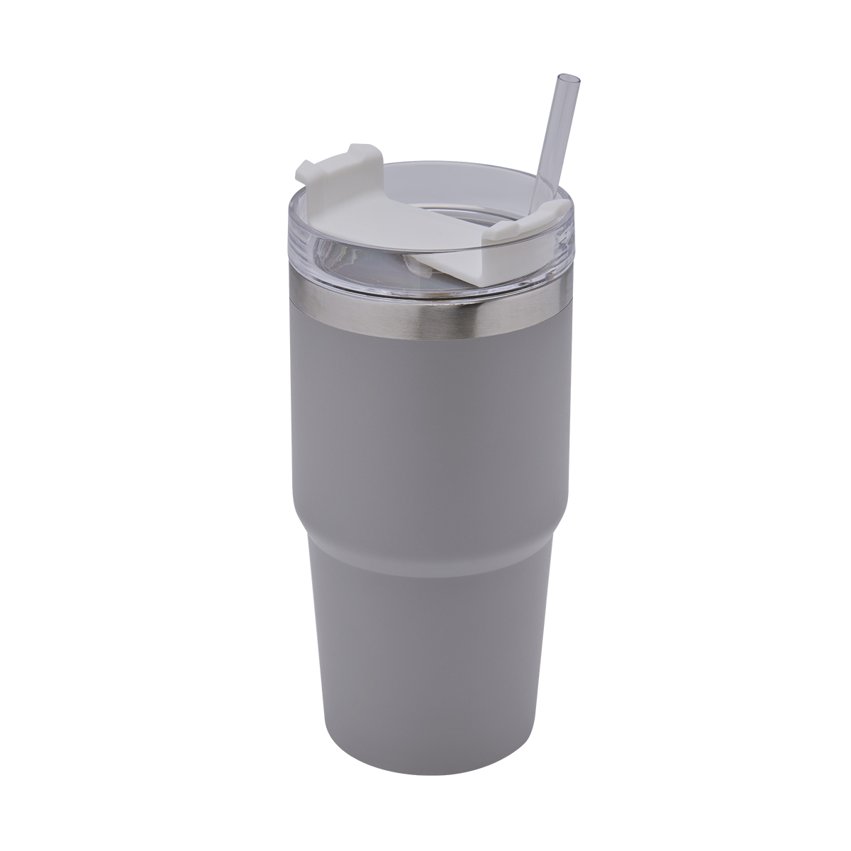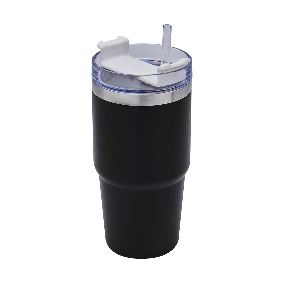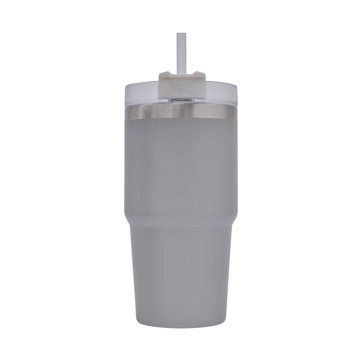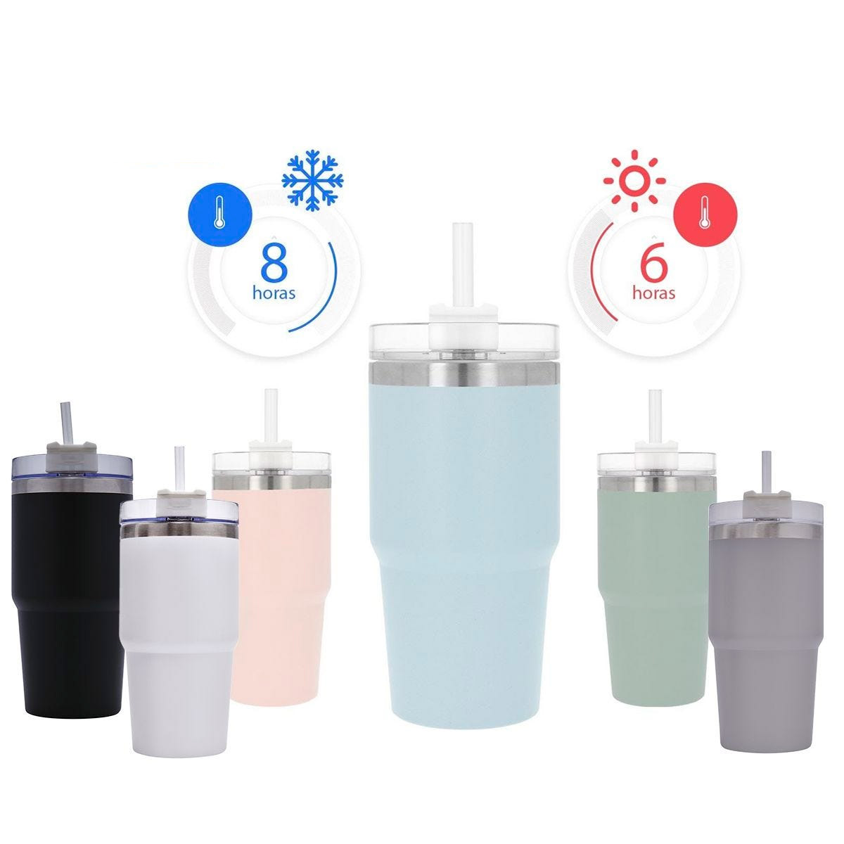Doble pared. Cerrado al vacío. Pared interna y externa acero inoxidable. Terminado rugoso. Incluye popote y tapa de plástico con tres posiciones. Mantiene temperatura caliente 6 hrs y temperatura fría 8 hrs aproximadamente.