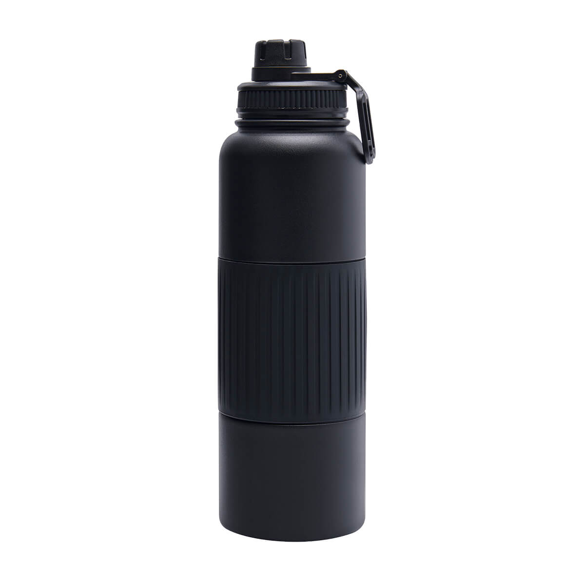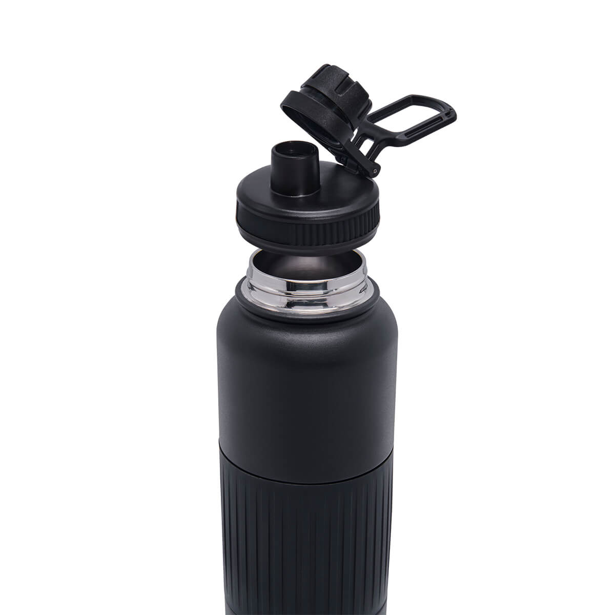 Termo doble pared con manga de silicón. Cerrado al vacío. Interior y exterior de acero inoxidable. Terminado tipo rugoso. Tapa de plástico con doble boquilla y asa. Incluye caja individual.