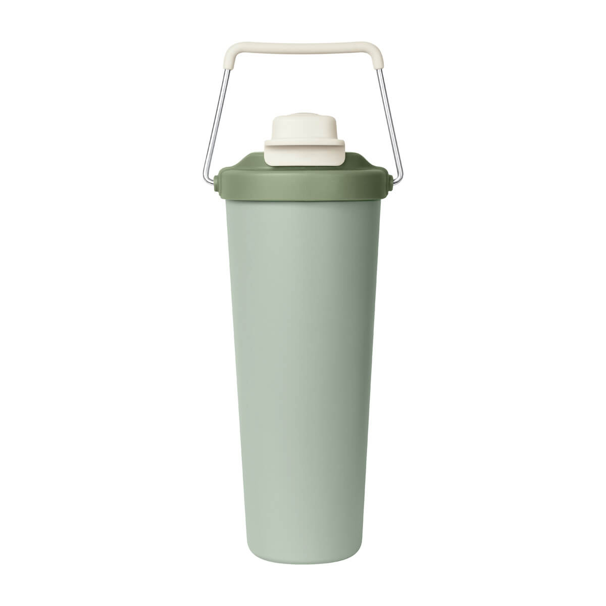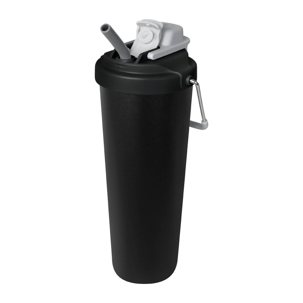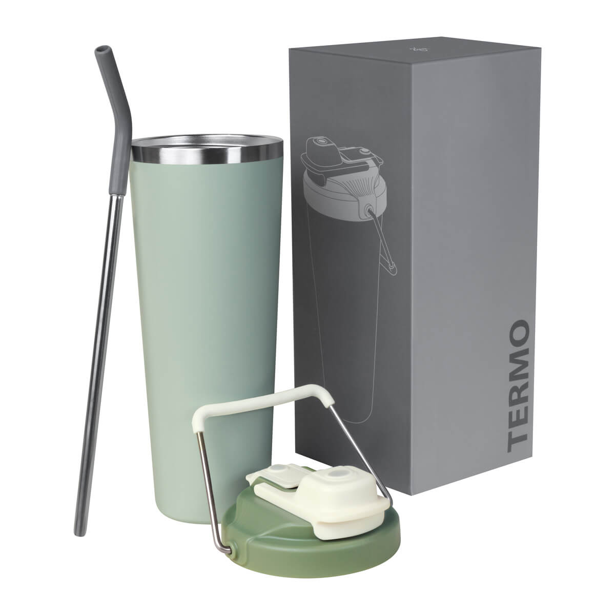 Termo doble pared. Cerrado al vacio. Pared interna y externa acero inoxidable. Cuerpo con terminado rugoso. Tapa de plastico con sistema de rosca y doble sobretapa con cierre push, una con boquilla para beber y otra con ranura para popote. Agrega un asa metalica con recubrimiento de silicon para llevarlo contigo a todos lados. Mantiene la temperatura caliente por 4 hrs y la temperatura fria por 8 hrs. Capacidad de 25 Oz. Base de 7 cm de diametro. Incluye caja individual.