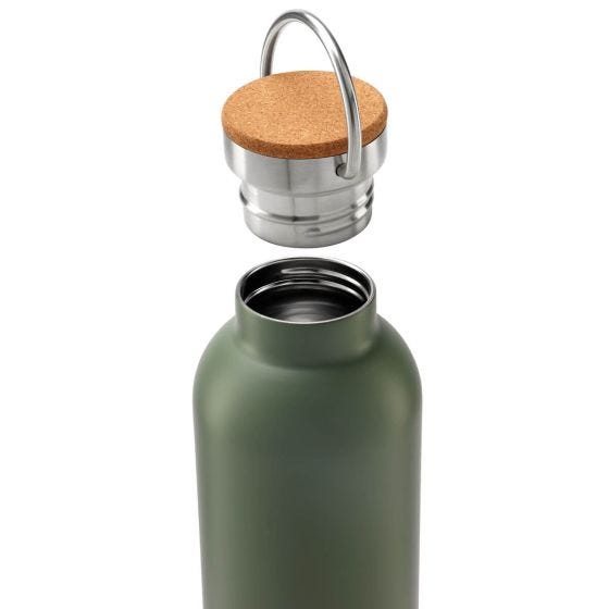 Doble pared. Cerrado al vacío. Pared interna y externa de acero inoxidable. Tapa con sistema de rosca de acero inoxidable con corcho y asa metálica. Mantiene temperatura caliente 6 hrs y temperatura fría 12 hrs. Incluye caja individual.