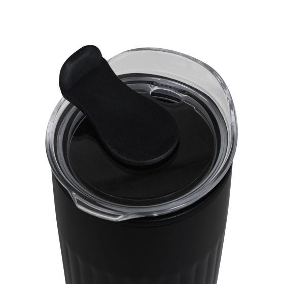Doble pared. Pared interna plastico, pared externa acero inoxidable. Tapa de plastico con sistema de push. Sobretapa de silicon movible. Incluye caja individual