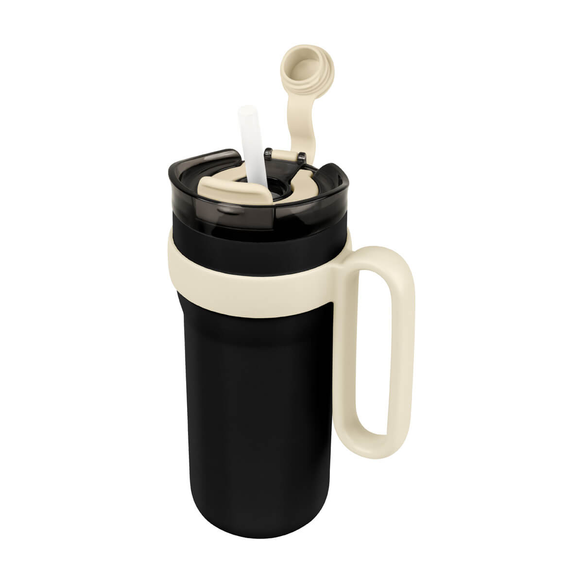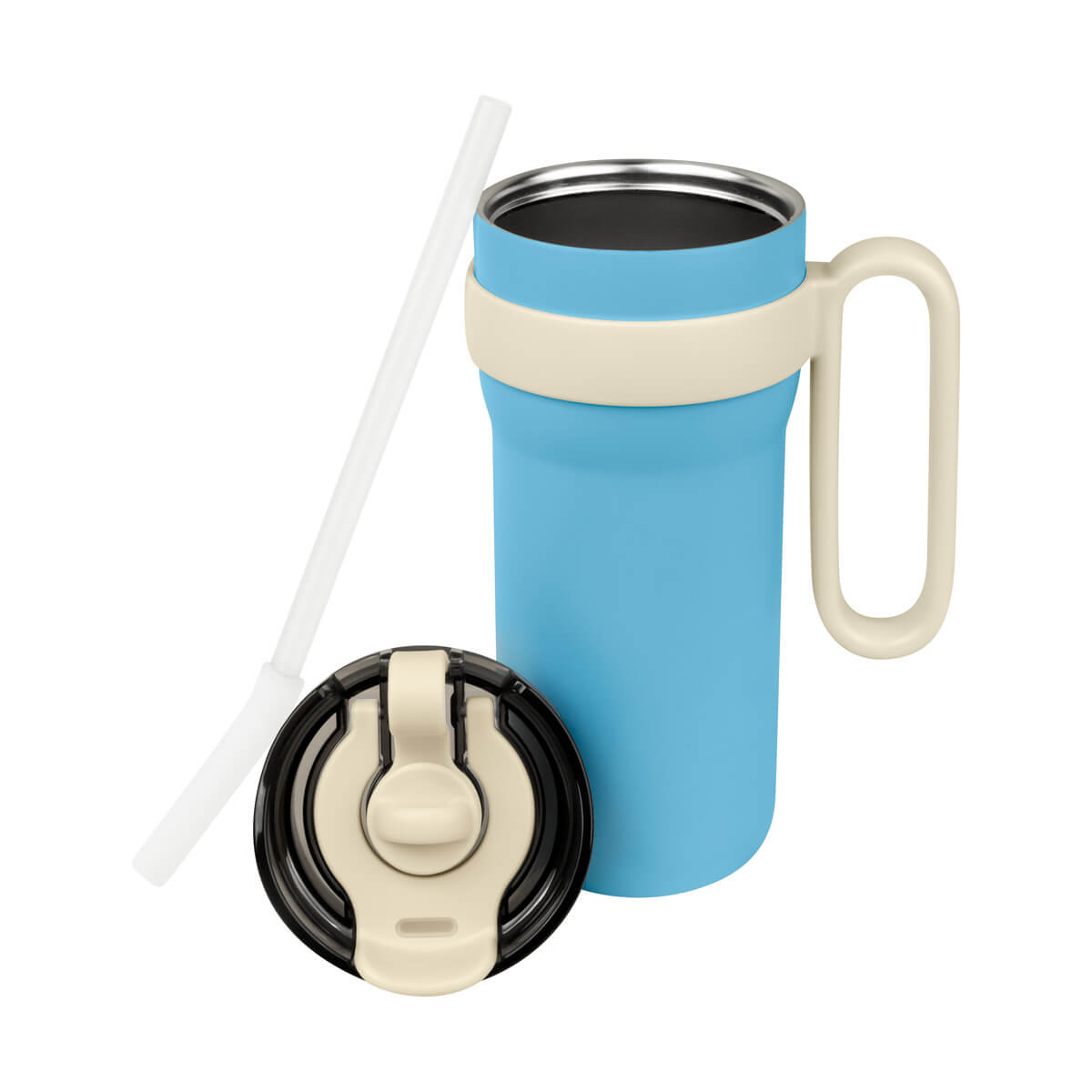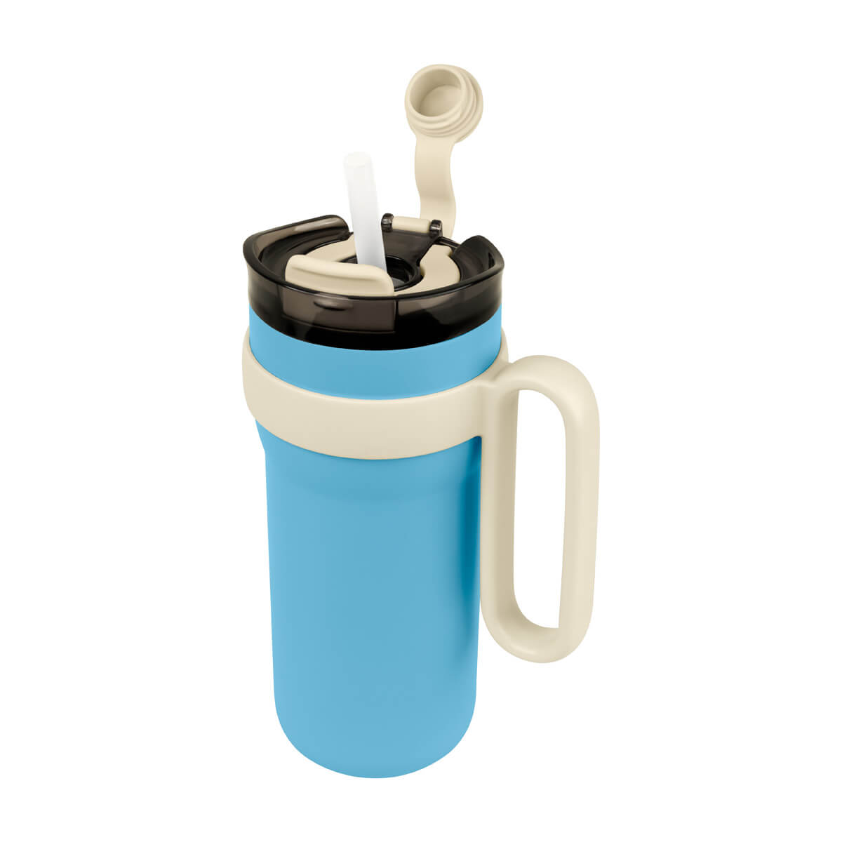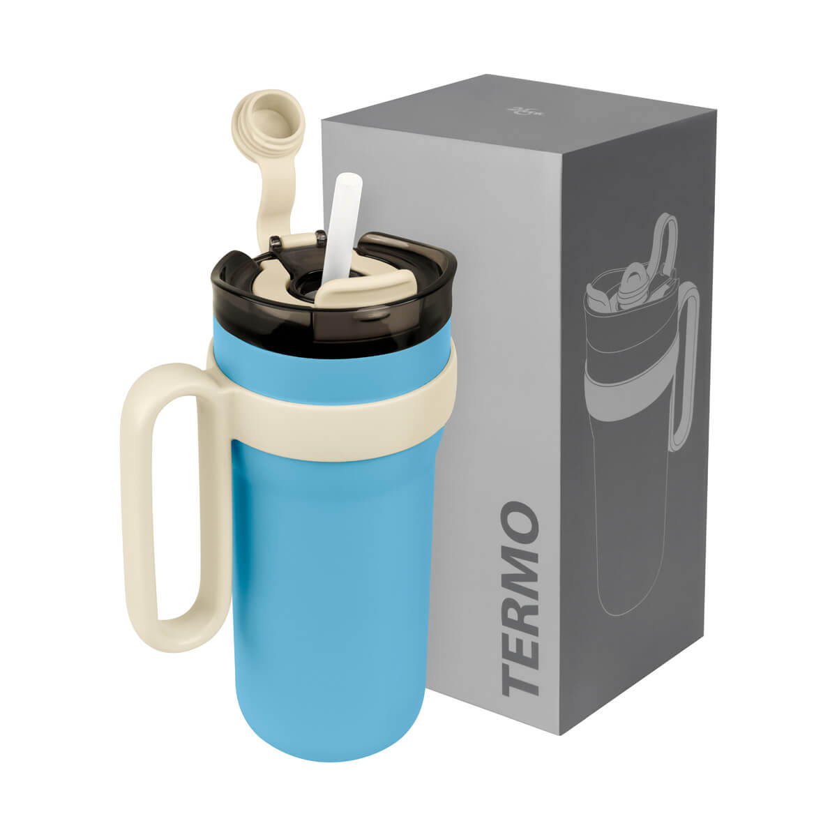 Termo doble pared. Cerrado al vacio. Pared interna y externa de acero inoxidable. Cuerpo con terminado rugoso. Incluye tapa con cierre de rosca que ofrece dos alternativas de uso, sobretapa con sistema push y ranura especial para popote con aditamento para cerrar y evitar derrames. Incluye popote de plastico que cuenta con un mecanismo de salida automatica y una base de silicon, que lo eleva al abrir el compartimento. Ademas, su original asa permite llevarlo comodamente a cualquier lugar. Mantiene temperatura caliente 6 hrs y temperatura fria 8 hrs. Capacidad 30 Oz. Base de 8.5 cm de diametro. Incluye caja individual.