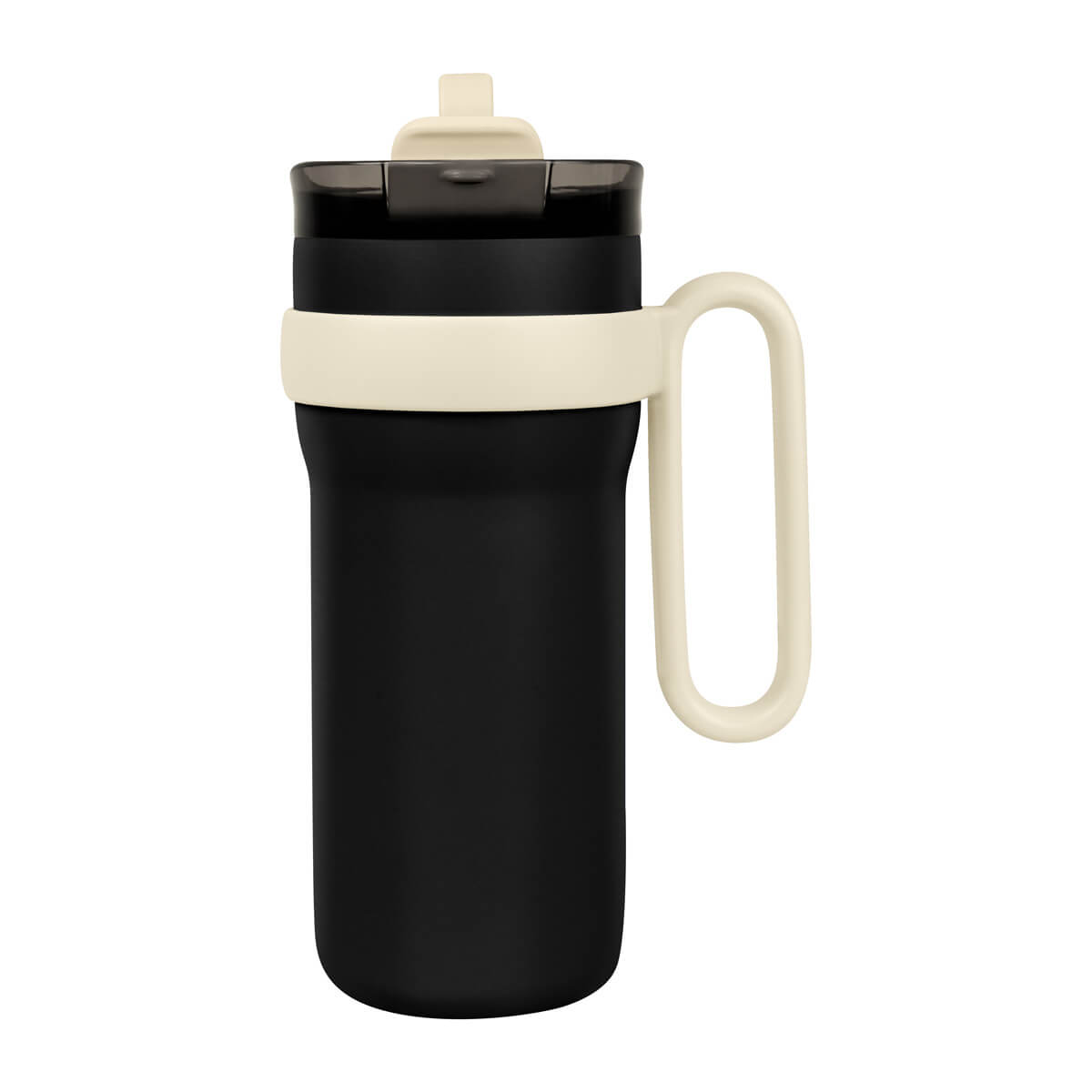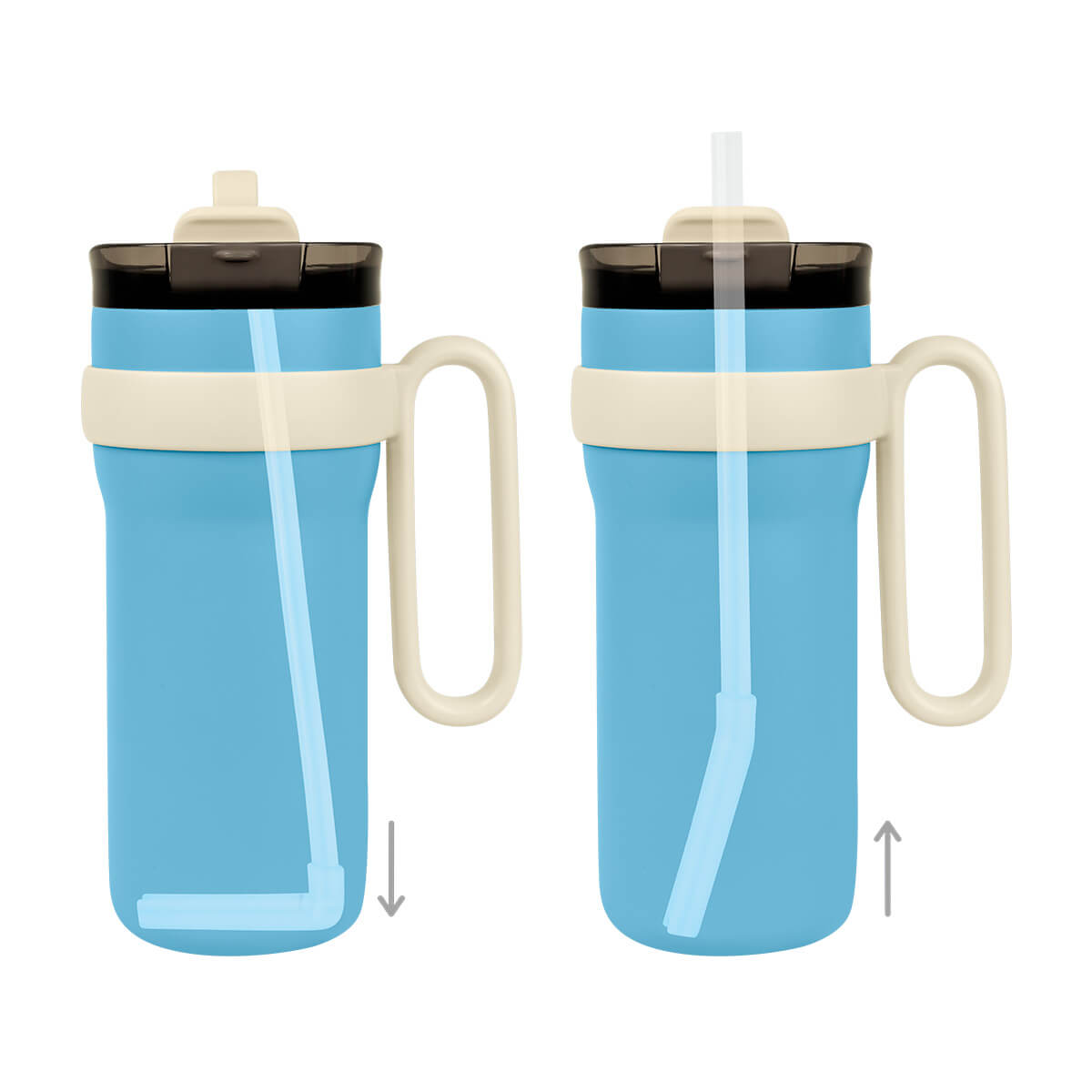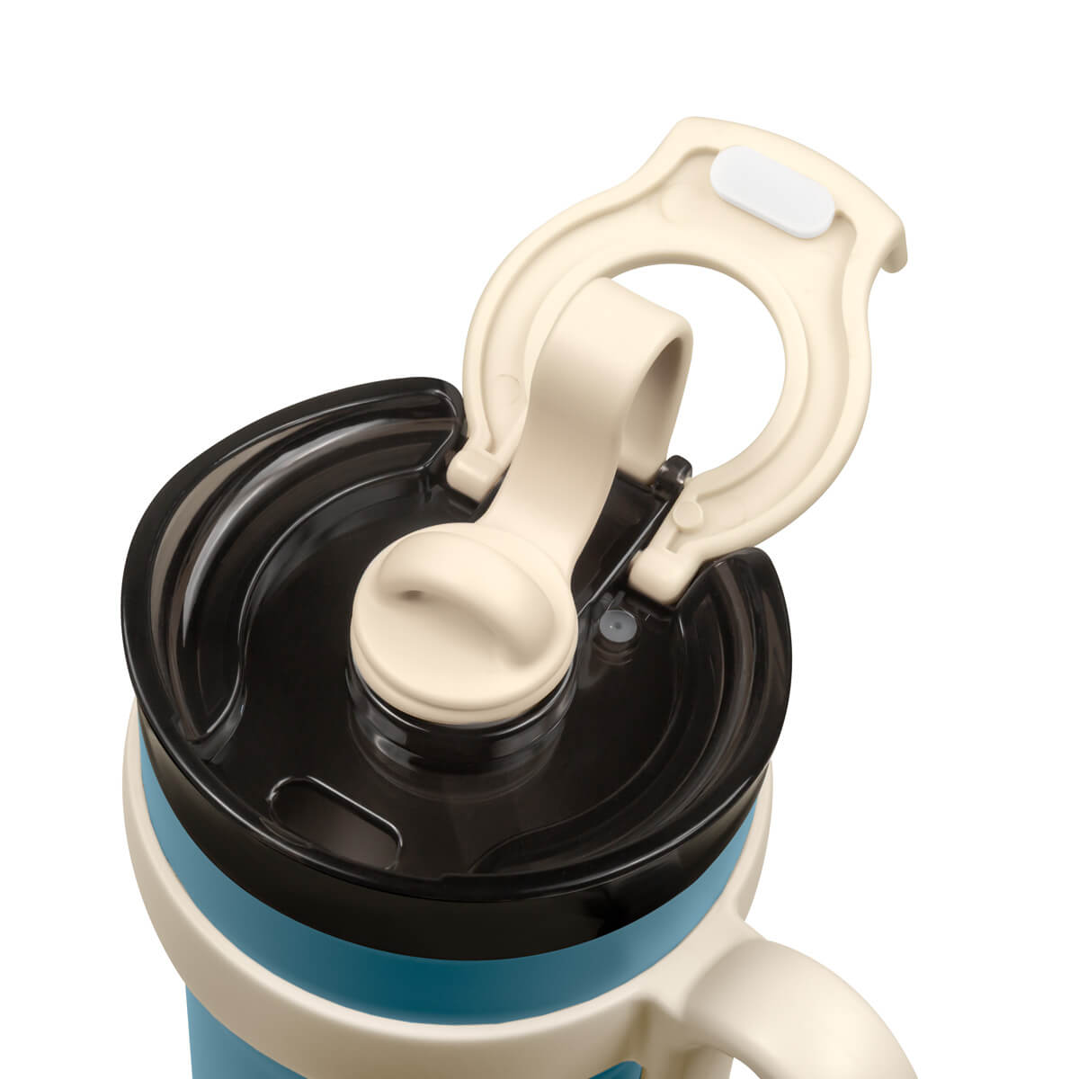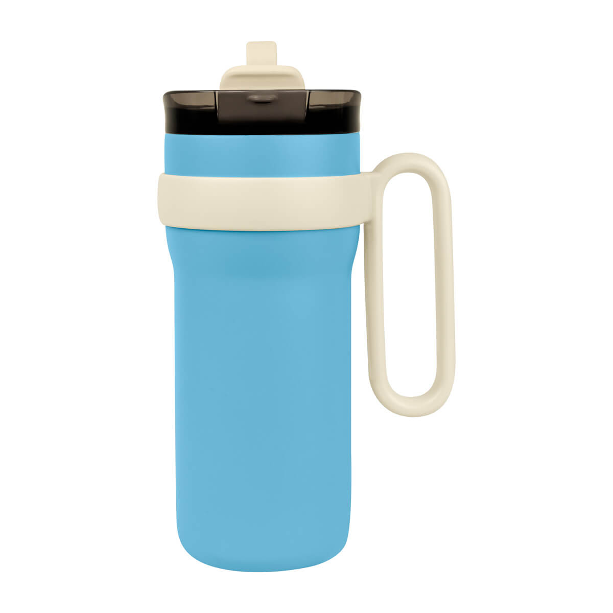 Termo doble pared. Cerrado al vacio. Pared interna y externa de acero inoxidable. Cuerpo con terminado rugoso. Incluye tapa con cierre de rosca que ofrece dos alternativas de uso, sobretapa con sistema push y ranura especial para popote con aditamento para cerrar y evitar derrames. Incluye popote de plastico que cuenta con un mecanismo de salida automatica y una base de silicon, que lo eleva al abrir el compartimento. Ademas, su original asa permite llevarlo comodamente a cualquier lugar. Mantiene temperatura caliente 6 hrs y temperatura fria 8 hrs. Capacidad 30 Oz. Base de 8.5 cm de diametro. Incluye caja individual.