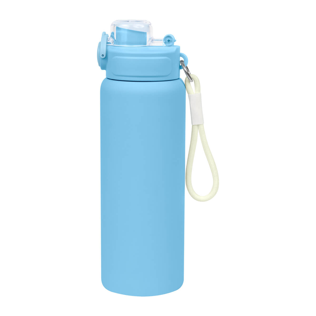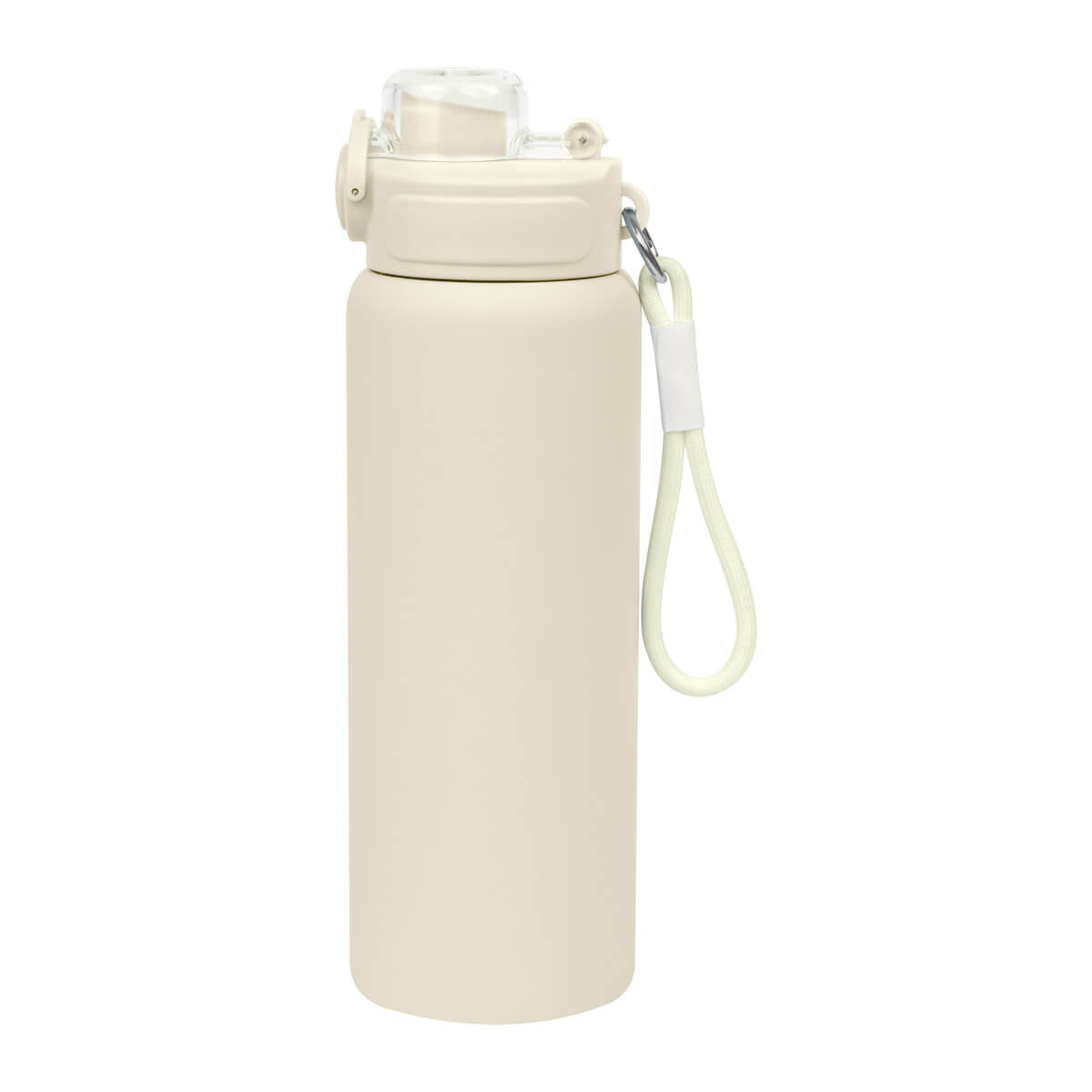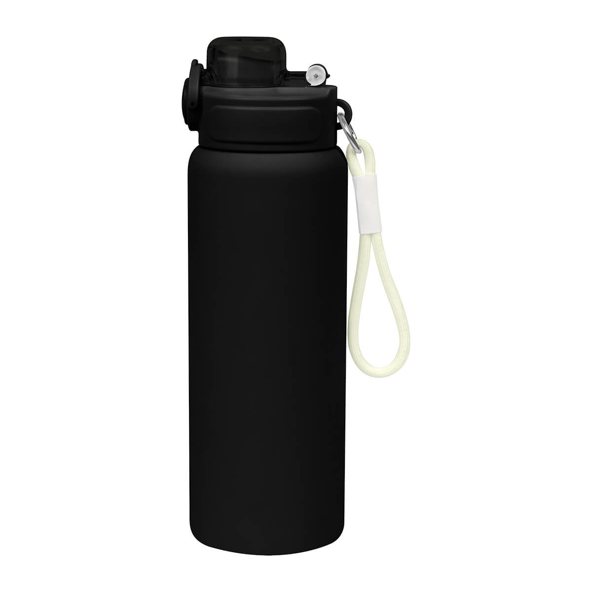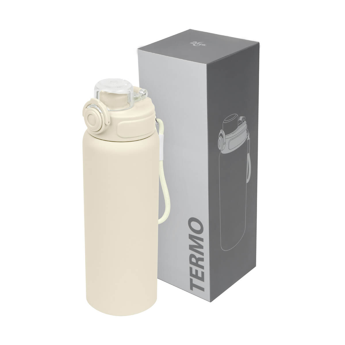 Termo doble pared. Cerrado al vacio. Pared interna y externa de acero inoxidable. Cuerpo con terminado tipo rubber, que lo hace suave al tacto. Tapa con cierre de rosca y sobre tapa tipo push para mantenerla seguro y limpio. Ademas con su nuevo diseno de boquilla, ofrece dos alternativas de uso, para beber normal o por medio de popote, ambas en la misma boquilla, sin ranuras adicionales. Mantiene temperatura caliente y fria por 8 hrs. Capacidad 27 Oz. Incluye asa de poliester, popote de plastico y caja individual.