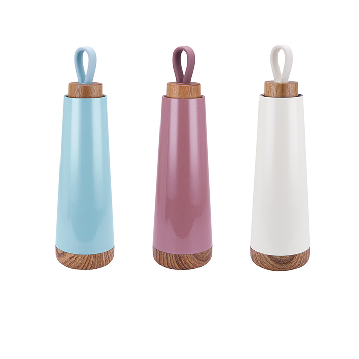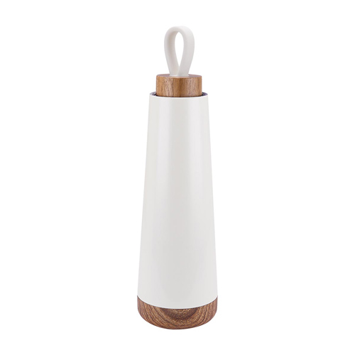 Doble pared. Cerrado al vacío. Pared interna y externa acero inoxidable. Tapa de madera de rosca con agarradera de silicón. Mantiene temperatura caliente 6 hrs y temperatura fría 12 hrs aproximadamente. Incluye caja individual.