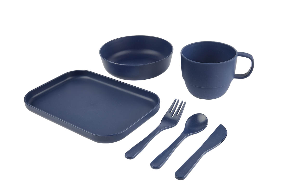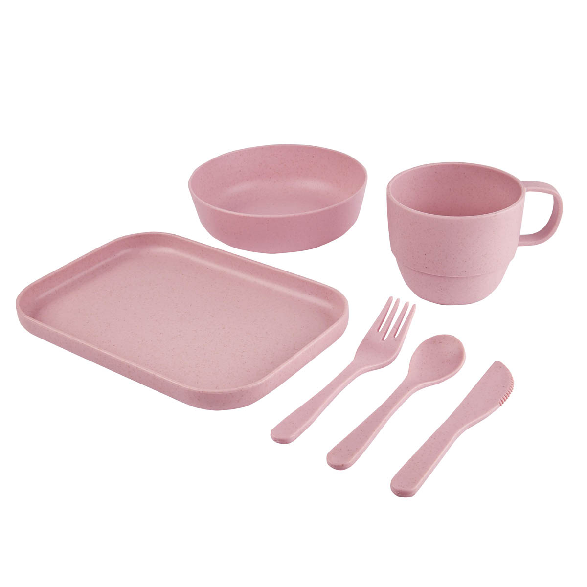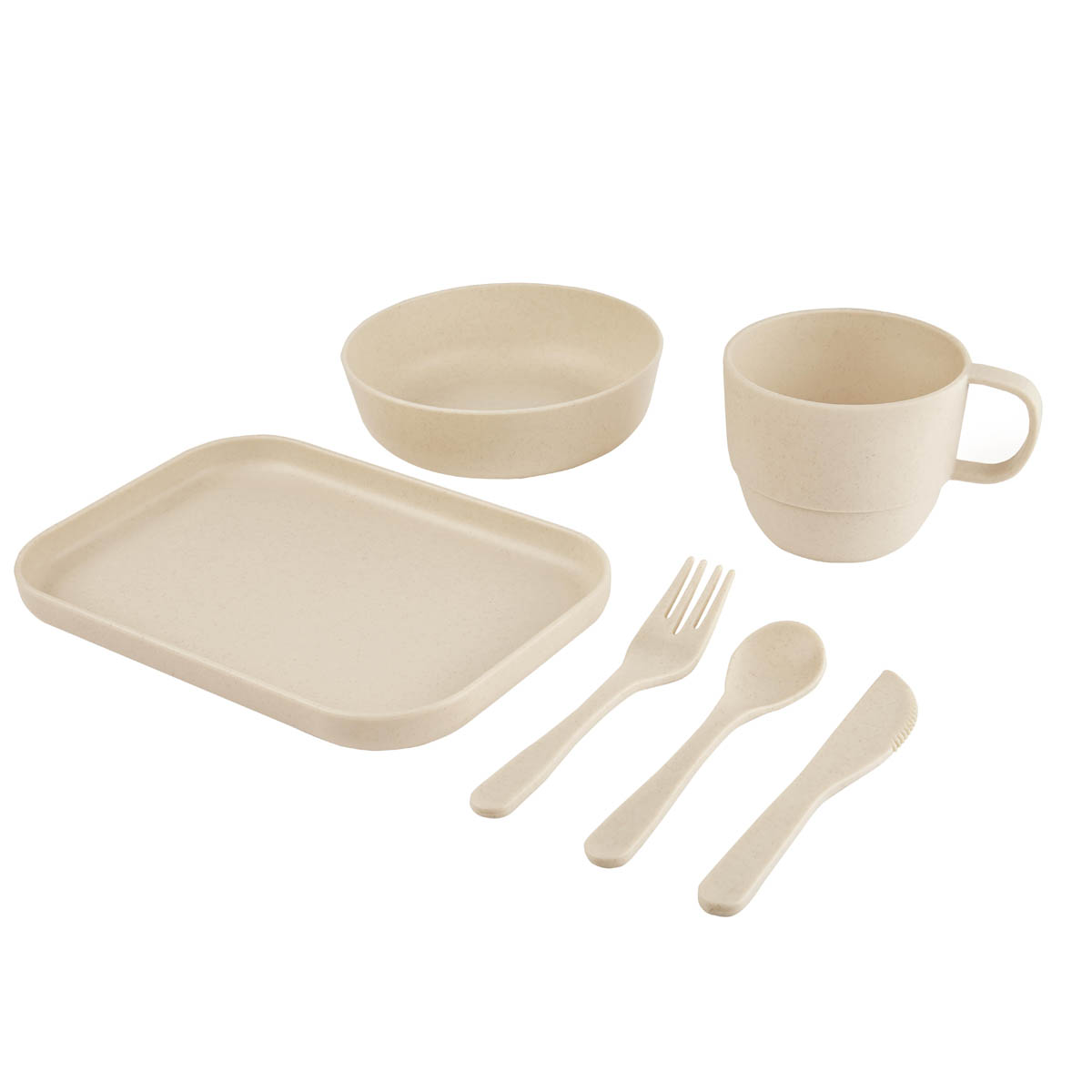 Vajilla de 6 piezas con material eco-friendly. Contiene bandeja, plato, taza, cuchara, tenedor y cuchillo. Con un diseño atractivo y funcional, es ideal tanto para los mas pequeños como para los adultos, garantizando una experiencia de comida segura y respetuosa con el medio ambiente. Incluye caja individual.