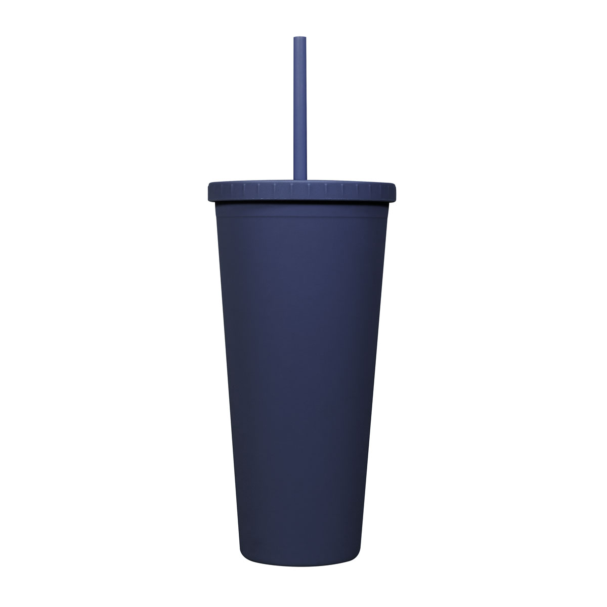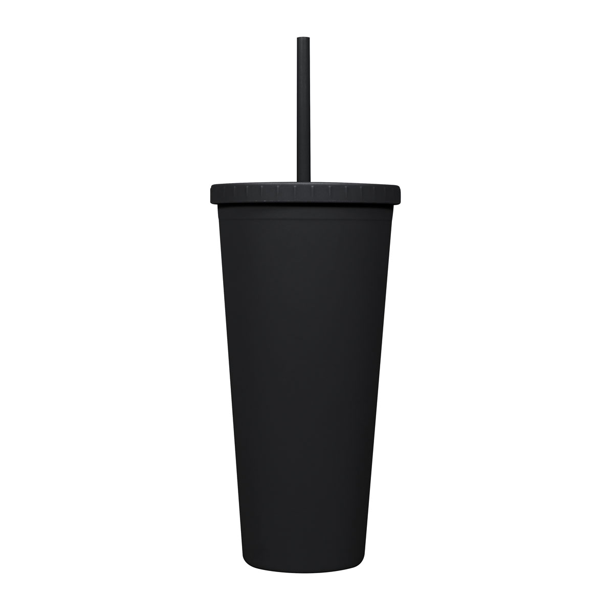 Doble pared. Pared interna y externa de plastico. Tapa de plastico con sistema de rosca. Incluye popote. Cuerpo y tapa con terminado tipo rubber. Capacidad 22 Oz. Base de 6.6 cm de diametro. Caja individual incluida.