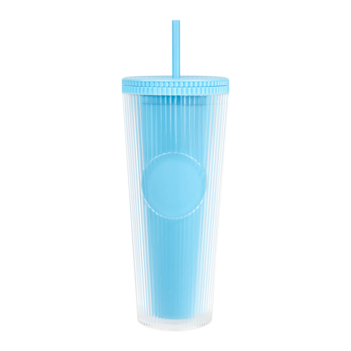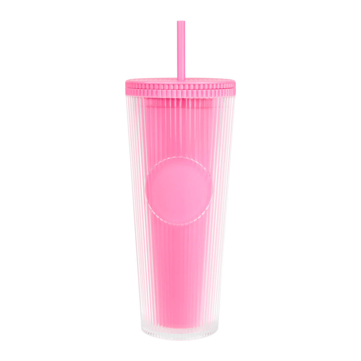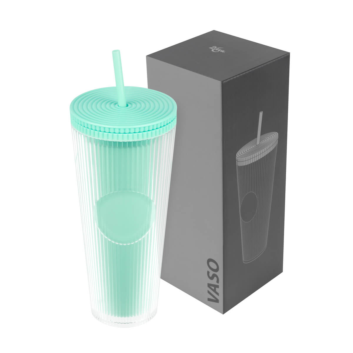 Vaso doble pared. Pared interna y externa de plastico. Tapa de rosca y ranura para popote. Disenado moderno de acabado texturizado, con lineas en relieve le dan un toque unico y moderno. Ideal para oficina, escuela o para disfrutar de tus bebidas mientras viajas. Capacidad de 24 Oz. Base de 7 cm de diametro. Incluye popote de plastico y caja individual.