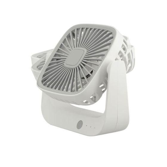 Ventilador portátil. Cuenta con botón de encendido para tres velocidades ajustables y LED indicador de potencia. Para su funcionamiento, el ventilador debe estar conectado a una fuente de energía, lo que garantiza un flujo de aire constante y potente. La base permite girar fácilmente el ventilador para colocarlo en diferentes ángulos. Su tamaño compacto lo hace ideal para espacios pequeños. Incluye cable auxiliar con conector tipo C y caja individual.