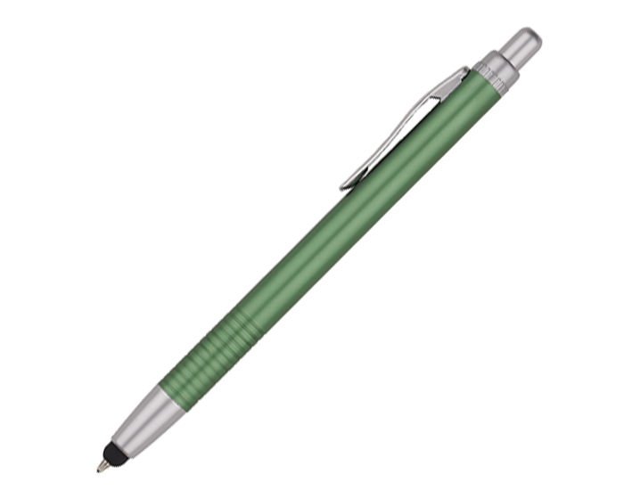 Boligrafo de aluminio con punta touch para pantallas táctiles. Cuenta con botón, clip y punta en color plata, cuerpo en diferentes colores y pequeñas hendiduras en la parte inferior para una mejor sujeción. Mecanismo de click.