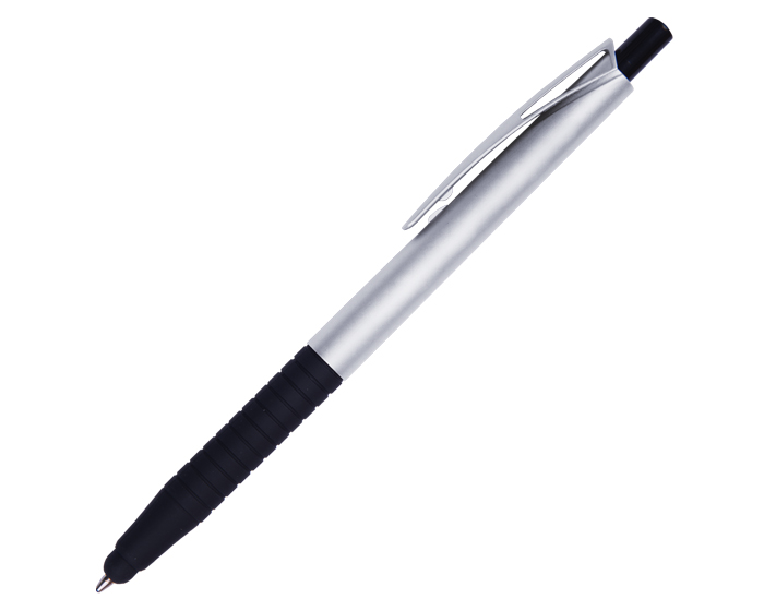 Bolígrafo de plástico en colores metálicos, punta touch y goma antideslizante. Mecanismo de click.