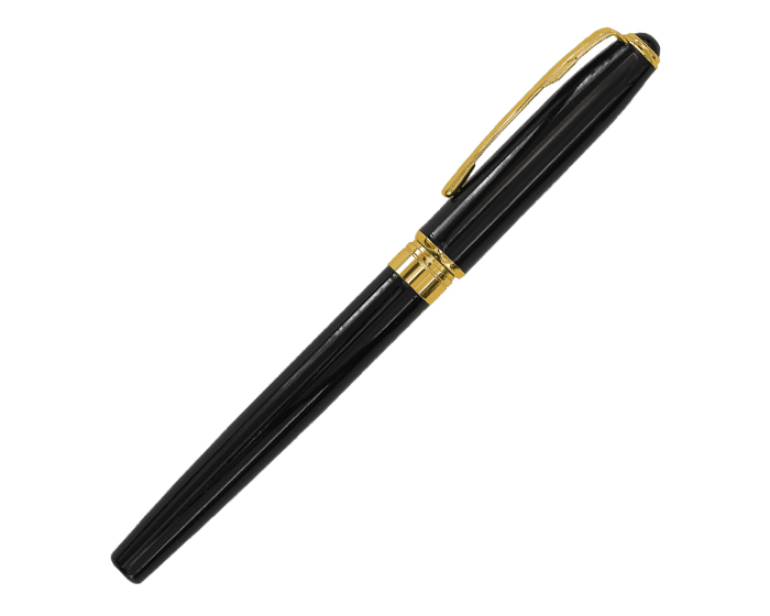 Elegante boligrafo metálico tipo roller de tinta alemana, con clip y detalles bañados en oro de 18 kilates. Cuenta con tapa que cierra a presión y repuesto especial con rosca para sujetarse firmemente. Incluye estuche de regalo en color negro.