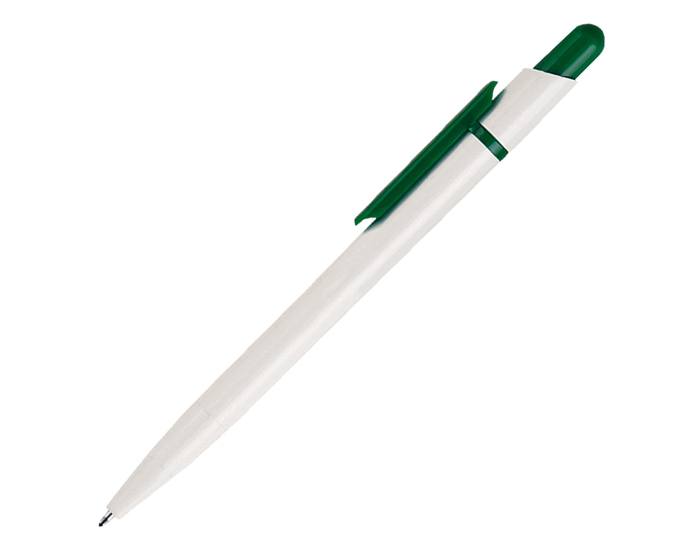 Bolígrafo de plástico cuerpo blanco, tapón y clip de color. Mecanismo de click.