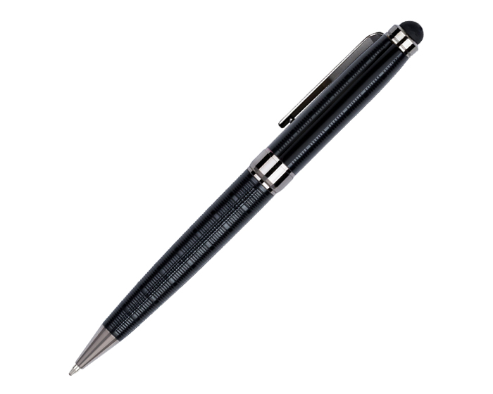 BOLÍGRAFO CON UN REFINADO DISEÍ‘O EN LÍNEAS HORIZONTALES DE REALCE, PUNTA DE ACERO INOXIDABLE, CLIP Y ANILLO EN COLOR PLATA, CON PUNTERO PARA PANTALLAS TÍCTILES. ESCRIBA CON COMODIDAD Y ELEGANCIA. MECANISMO RETRÍCTIL. PRESENTACIÍ“N: CAJA DE REGALO