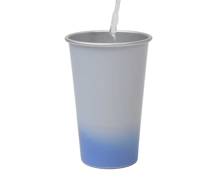 Vaso de aluminio de grado alimenticio, que cambia de color con bebidas frías (menores a 8°C). No apto para bebidas calientes. CAP. 470 ml.