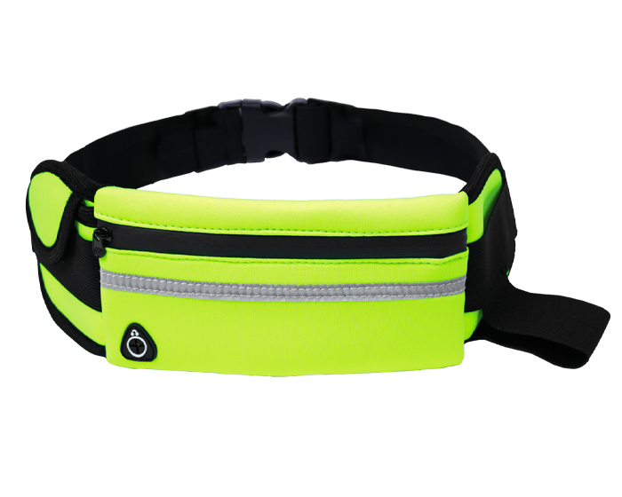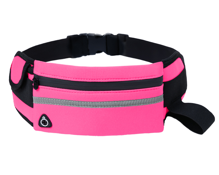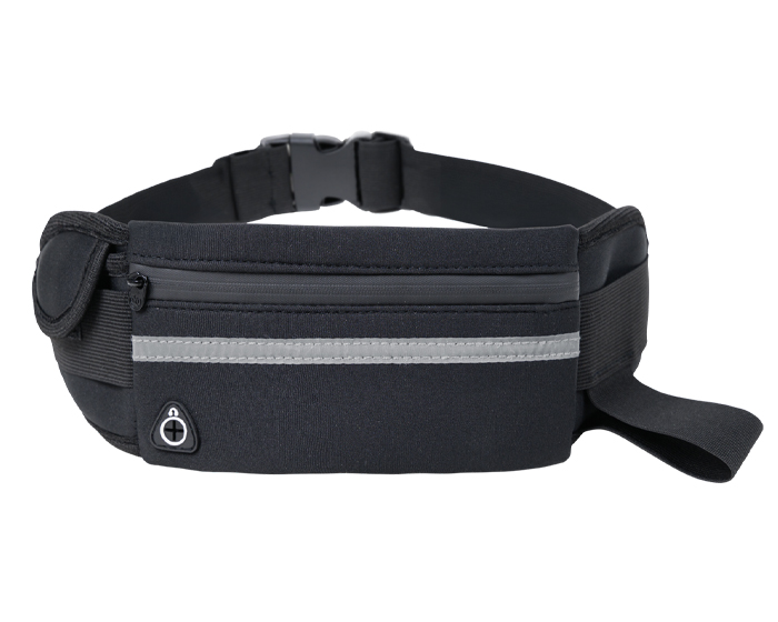 Cangurera con cinta de resorte ajustable y broche de seguridad. Cuenta con 2 compartimentos laterales, 1 para guardar accesorios con broche de contacto y otro de resorte para botellas. Compartimento interno con cierre, cinta reflejante y salida para audífonos de cable.