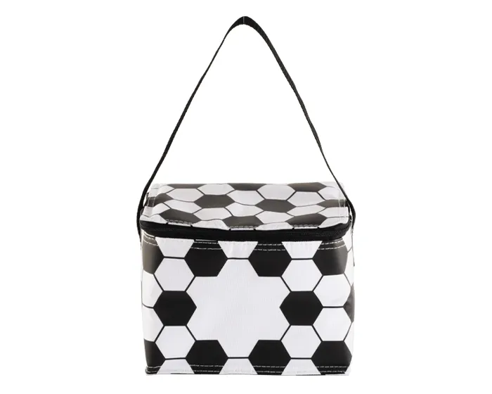 Lonchera / Hielera rectangular con diseño de balón de futbol soccer, tiene cubierta cosida e interior termosellado en plástico anti escurrimiento. Cuenta con cierre y correa larga. CAP. 6 latas.