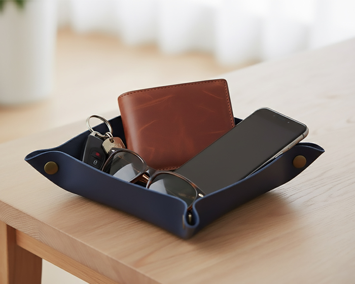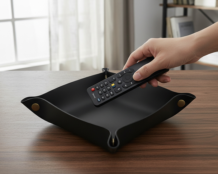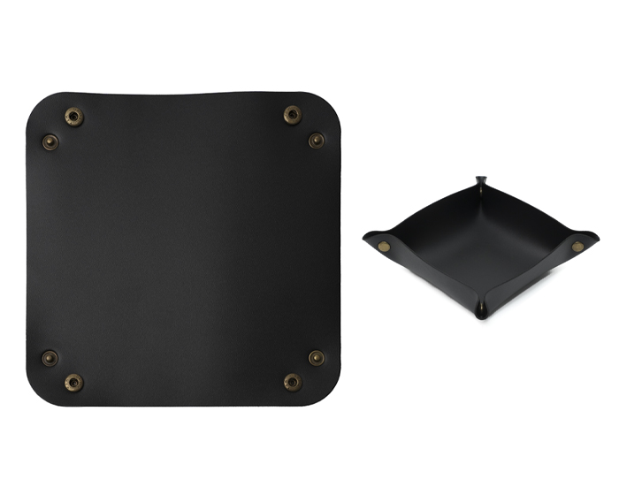 Bandeja de mesa de cuero PU para llaves, lentes, celular, monedas, etc.; cuenta con broches a presión en las esquinas para armar la charola. Útil para mantener organizada la mesa de entrada, buró, escritorio, baño, etc.