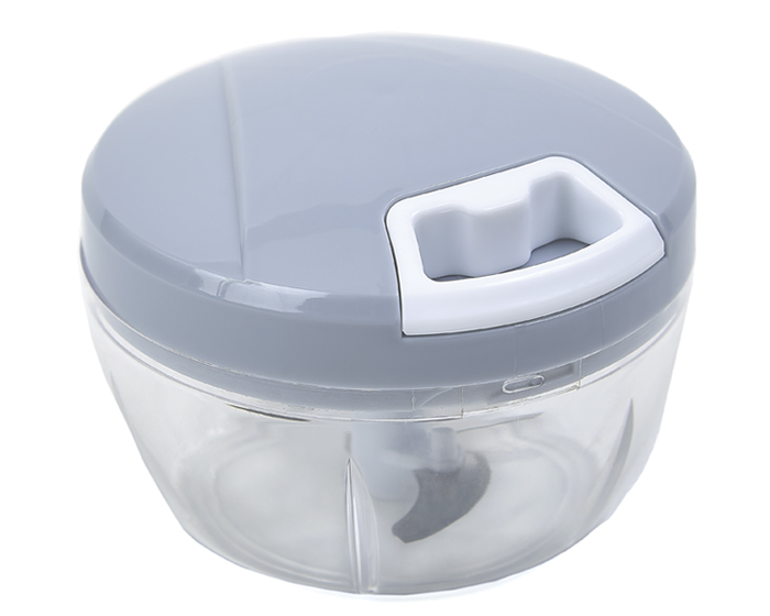 Triturador de alimentos con cuerda manual, recipiente de plástico, tapa enroscable y aspa de acero inoxidable. Presentación: caja en color blanco.