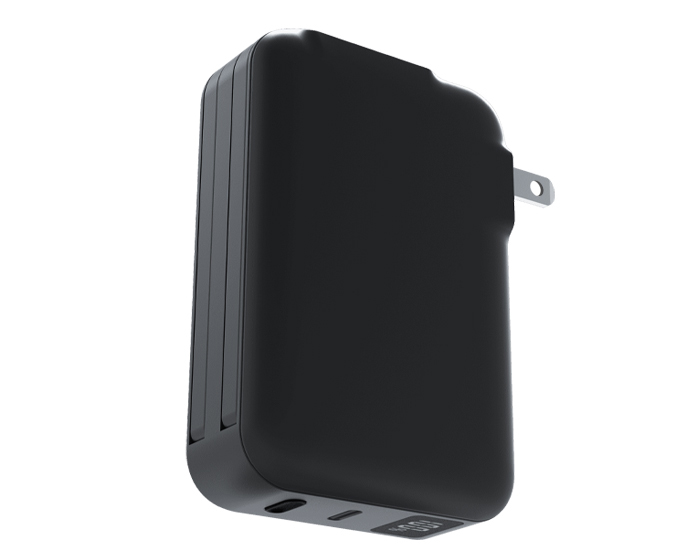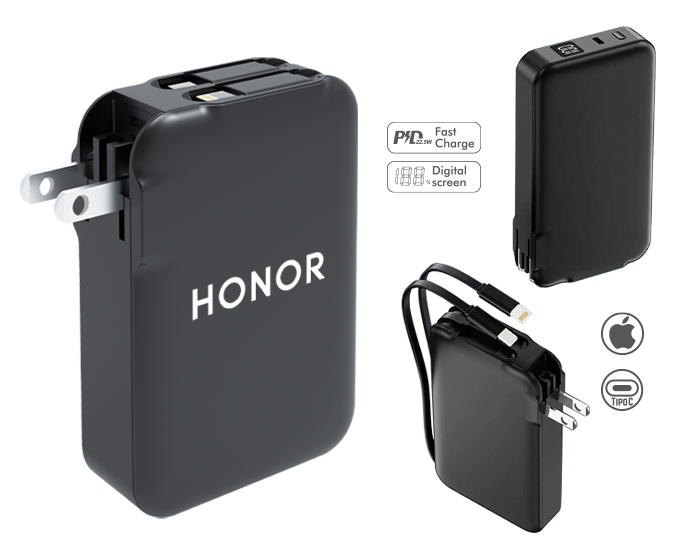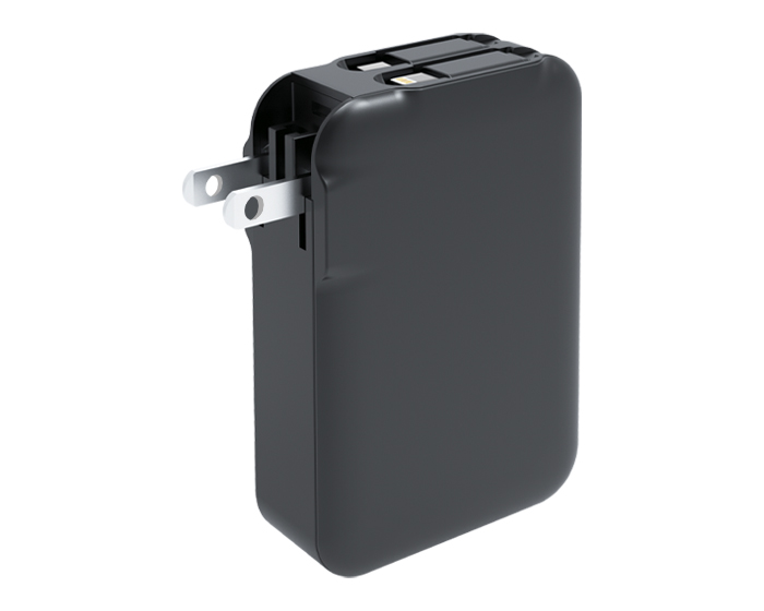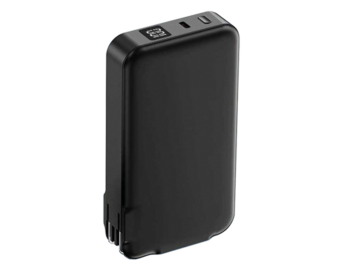 Batería de carga rápida con función de adaptador de corriente plegable con capacidad de 5,000 mAh. Cuenta con pantalla digital que indica el porcentaje de la batería, entrada de carga tipo C (Incluye cable de carga), botón de encendido/apagado y 2 cables de salida para carga de dispositivos móviles: 1 entrada tipo C y uno entrada para I phone. Presentación: Caja de regalo a color.