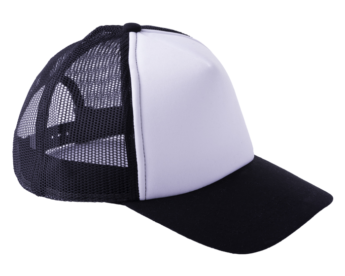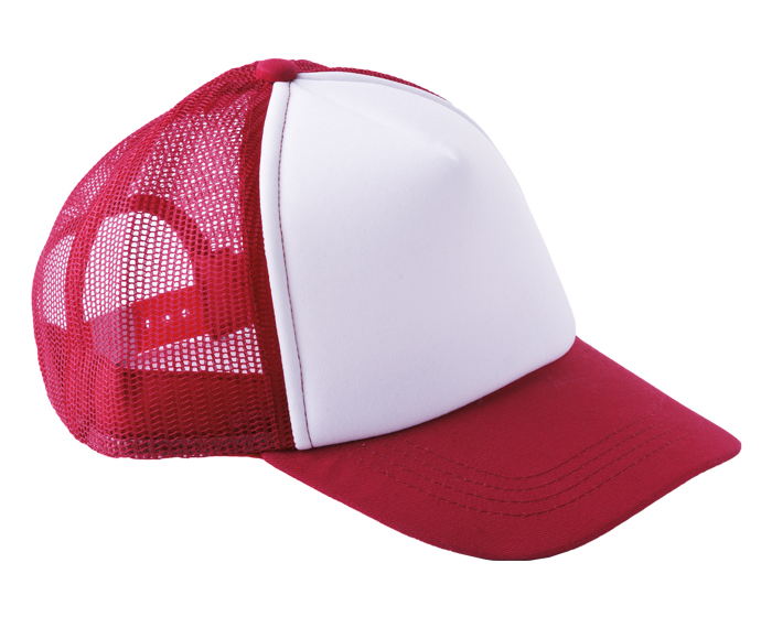 Gorra en poliester con visera de algodón. Con frente acolchado y gajos en malla, banda ajustable en plástico.