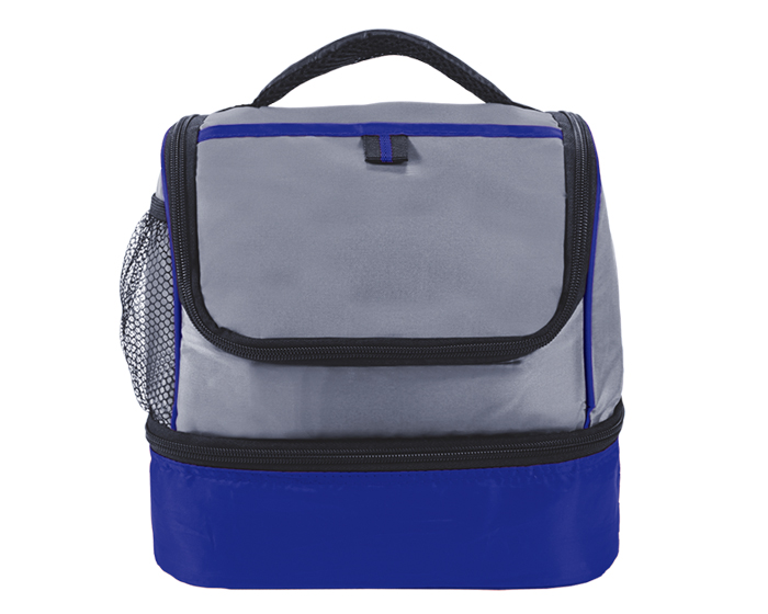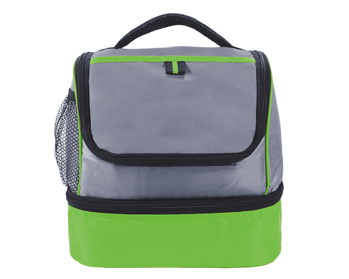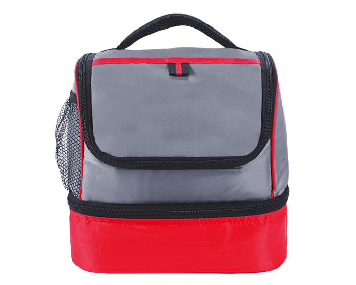 Lonchera térmica con dos compartimentos, bolsa lateral de malla y asa para transportar.