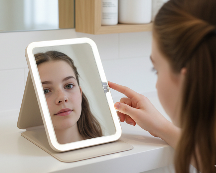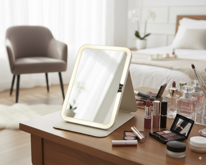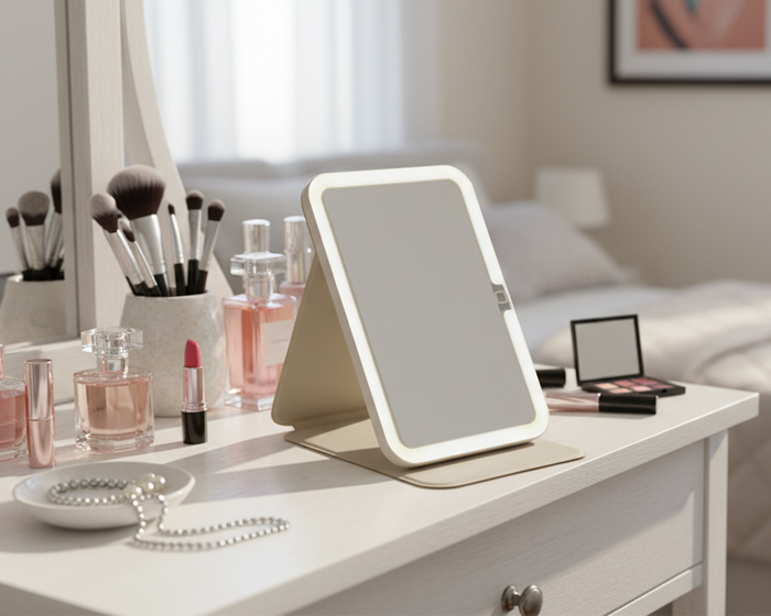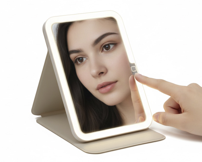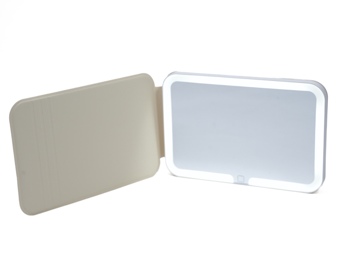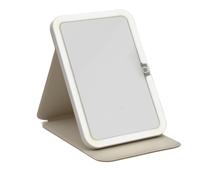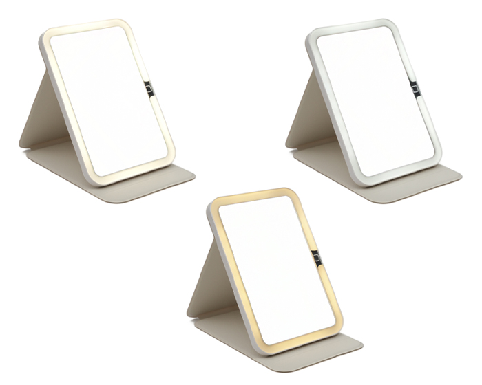 Espejo de maquillaje de luz LED con 3 tipos de luz: natural, fría y cálida, con ajuste de intensidad de brillo. Cuenta con cubierta de PU que sirve para proteger y como soporte para 3 niveles de inclinación. Ocupa batería recargable con entrada tipo C. Tiempo de carga: 2 hrs., duración de carga: de 2-3 horas según el uso. Accesorios: Cable USB tipo C. CAPACIDAD DE CARGA: 400 mAh. Entrada de carga: 5 V cc Salida: 5 V cc. Presentación: Caja individual.