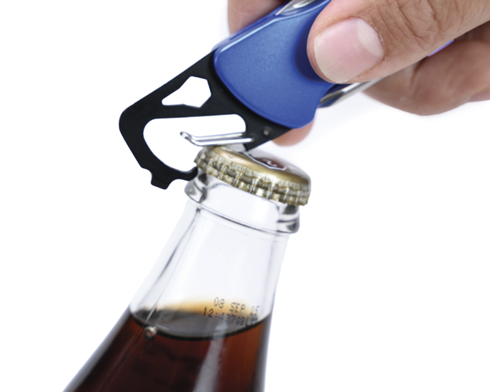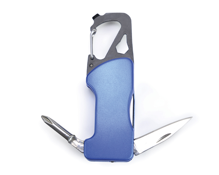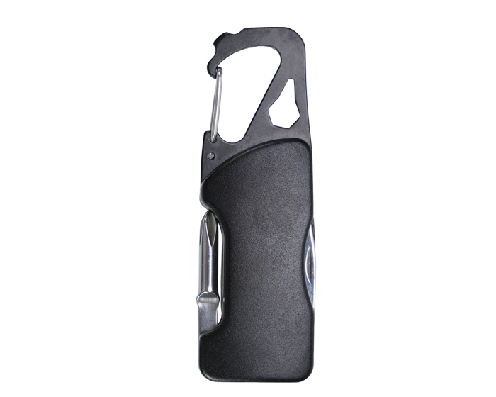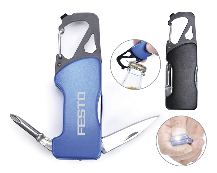 Gancho con clip multifunción que incluye: Luz LED con botón de encendido/apagado, navaja, destapador, llave allen, mini desarmador plano y desarmador de cruz. Incluye 2 baterías de botón. Presentación: caja individual de kraft.