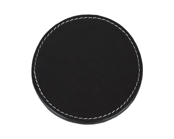 Juego de 4 posavasos redondos de curpiel con detalle de costura en hilo blanco. Incluye base del mismo material.