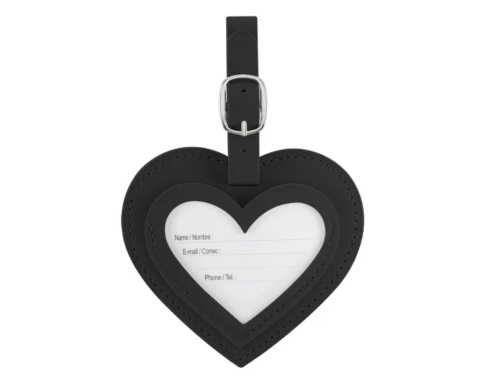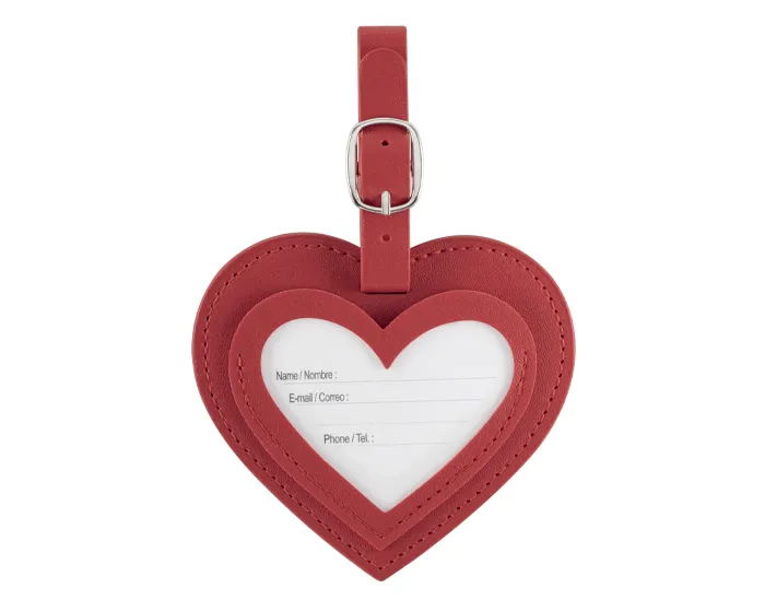 Identificador de equipaje de PU en forma de corazón. Cuenta con una pulsera ajustable para el equipaje y tarjeta para datos personales en español/inglés.