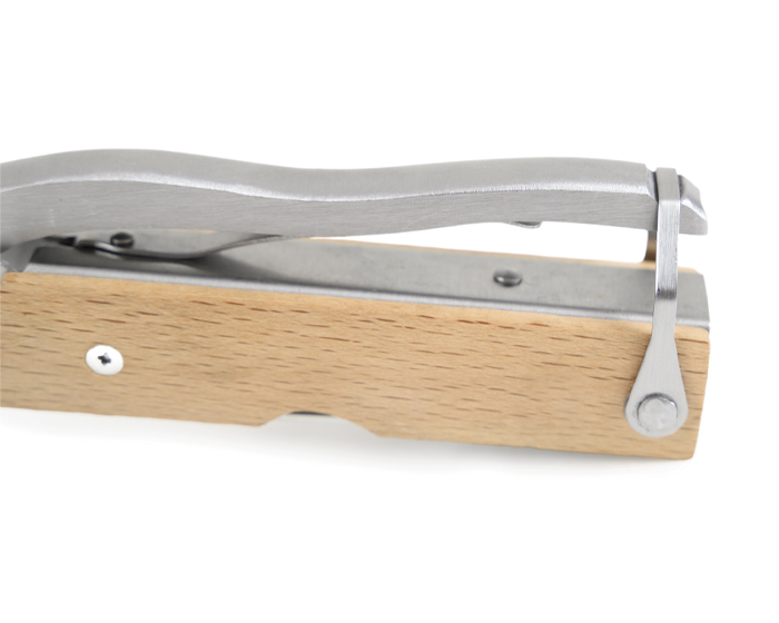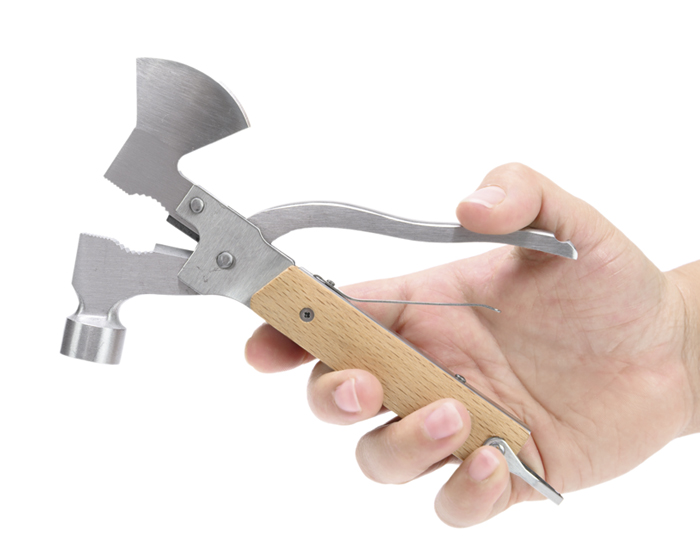 Multi herramienta plegable tipo martillo con mango de madera y 14 funciones: Hacha, alicatas redondas, alicatas planas, martillo, navaja de sierra con lima, desarmador plano pequeño, destapador de botellas, llave múltiple, desarmador plano grande, descamador de pescado, desarmador de cruz, navaja, cortador de alambre y arillo para colgar. Presentación: caja de regalo a color.