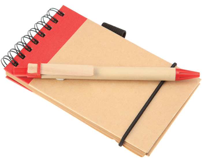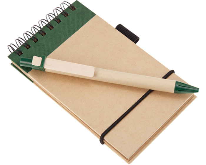 Libreta de papel reciclado con cinta elástica. Incluye pluma de papel con clip de madera.