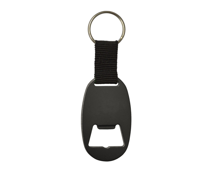Llavero destapador en color metalizado con cinta y arillo para colgar.