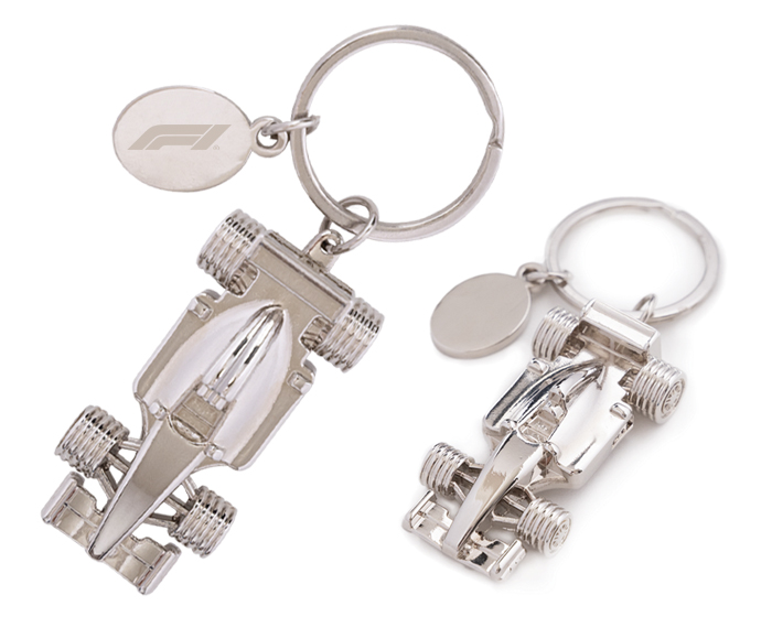 Llavero metálico en forma de auto de carreras con placa de aleación de zinc y arillo reforzado. Presentación: Caja individual de kraft.