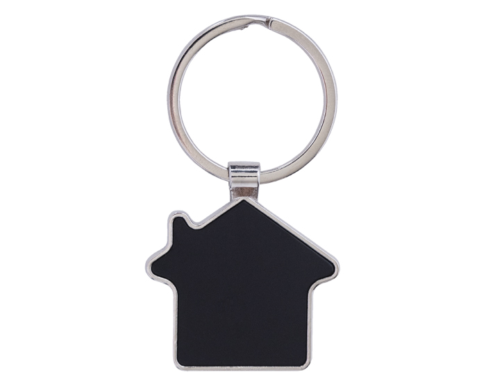 Llavero de aleación de zinc de color negro mate, con arillo reforzado de metal. Presentación: caja individual de kraft.
