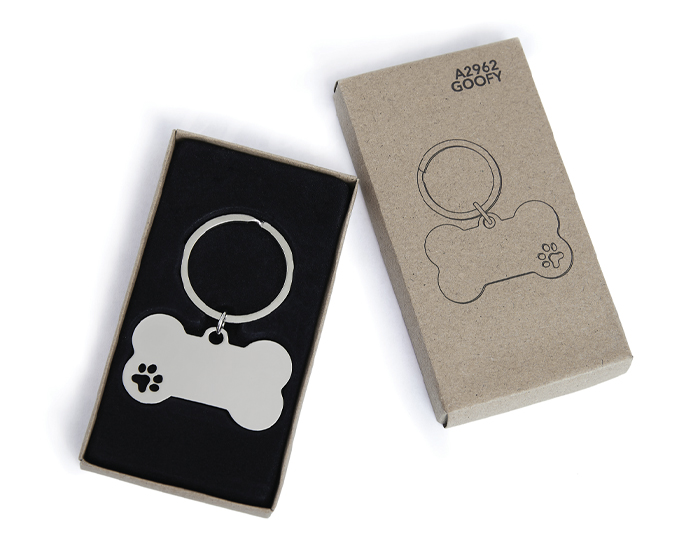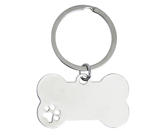 Llavero en forma de hueso con arillo reforzado y detalle de huellita. Presentación: Caja individual en color negro.