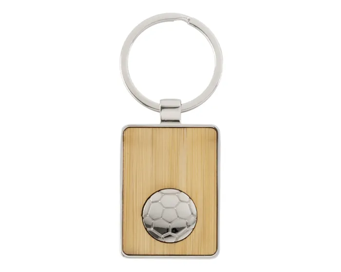Llavero de bambú con balón metálico de futbol de soccer. Presentación: Caja individual.