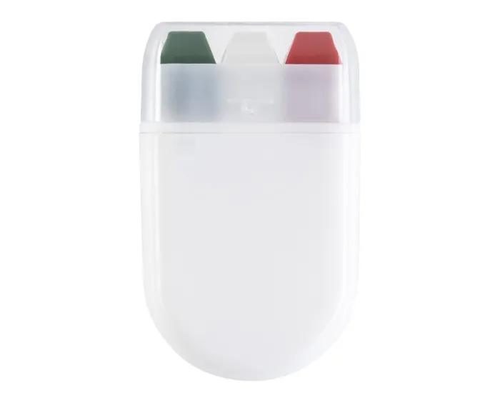 Barra de pintura facial tricolor en verde, blanco y rójo; cuenta con estuche de plástico con tapa para su fácil aplicación y manejo.